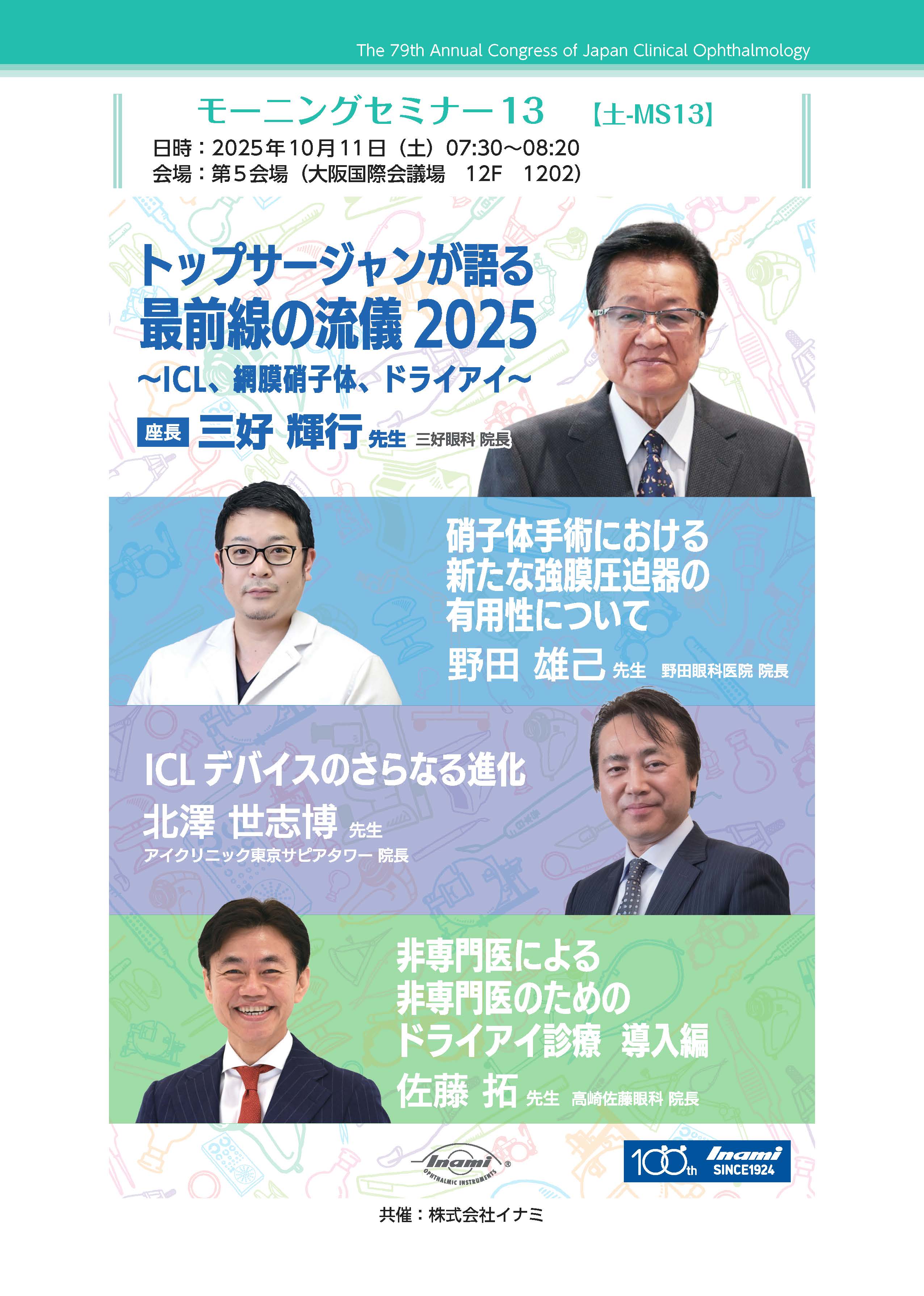 モーニングセミナー 13 トップサージャンが語る最前線の流儀2025~ICL、網膜硝子体、ドライアイ~ 2025年10月11日(土) 7:30 - 8:20 第5会場 | 大阪国際会議場 12F 1202 共催:株式会社イナミ |
