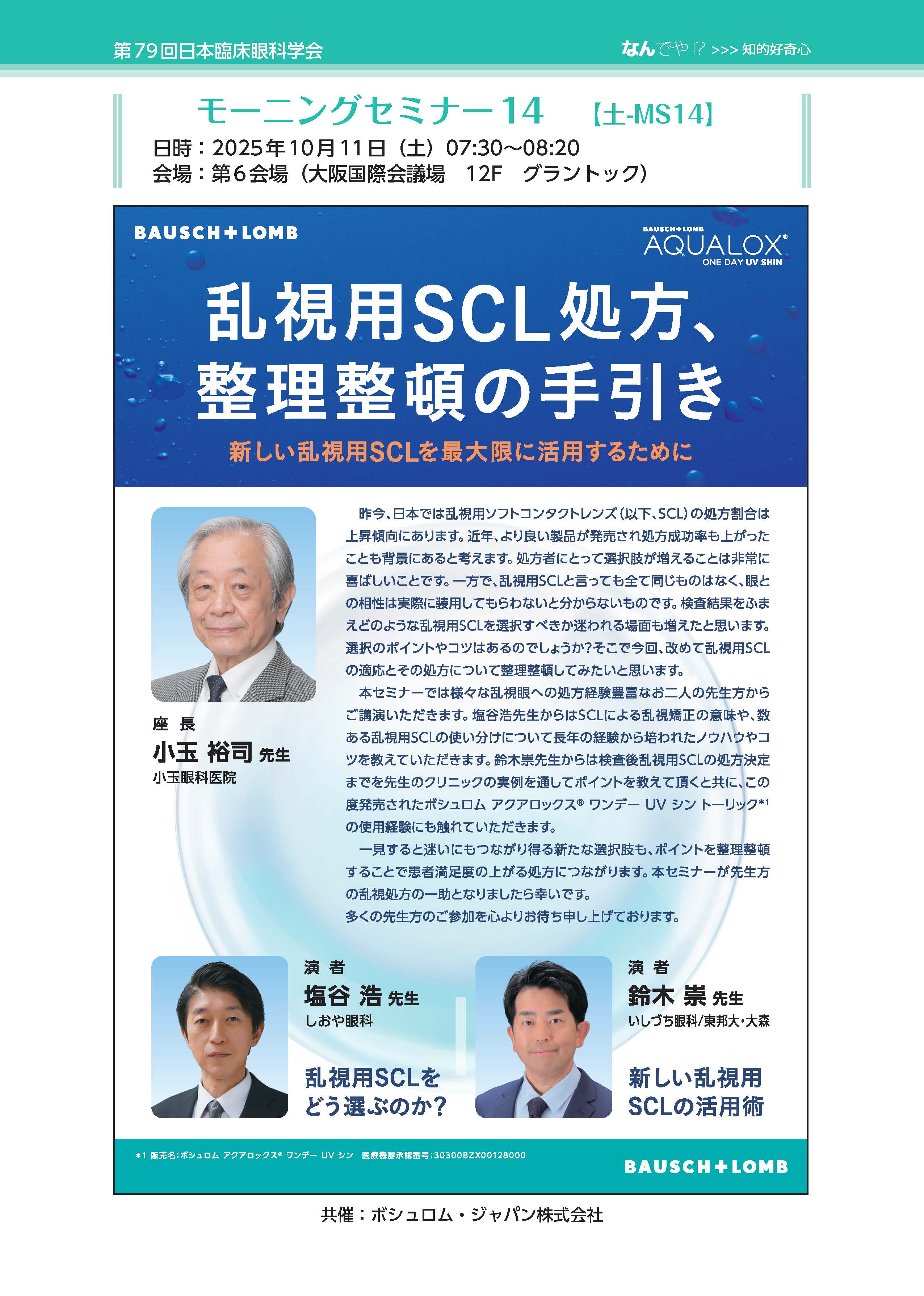 モーニングセミナー 14 乱視用SCL処方、整理整頓の手引き ~新しい乱視用SCLを最大限に活用するために~ 2025年10月11日(土) 7:30 - 8:20 第6会場 | 大阪国際会議場 12F グラントック 共催:ボシュロム・ジャパン株式会社 |