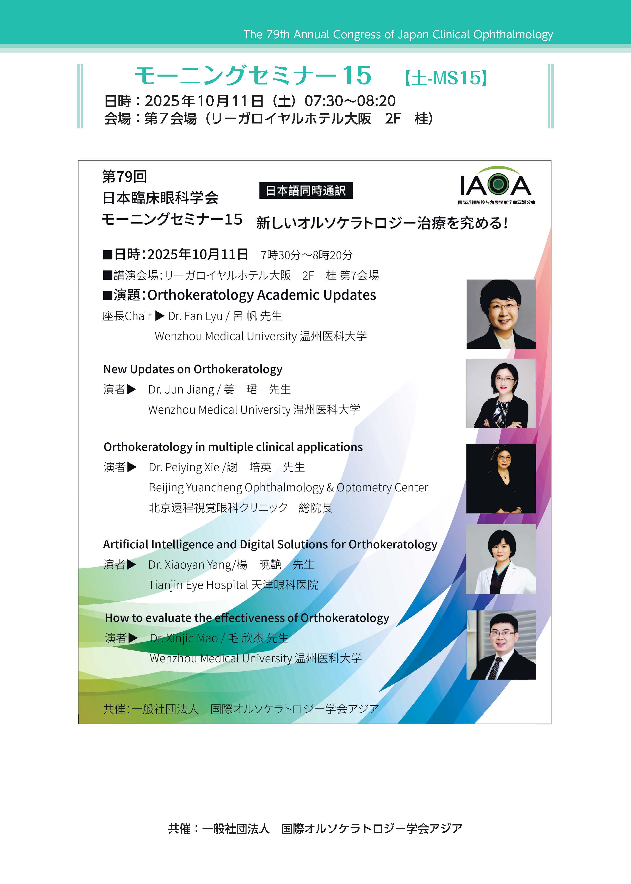 モーニングセミナー 15 新しいオルソケラトロジー治療を究める! Orthokeratology Academic Updates 2025年10月11日(土) 7:30 - 8:20 第7会場 | リーガロイヤルホテル大阪 2F 桂 共催:一般社団法人 国際オルソケラトロジー学会アジア |