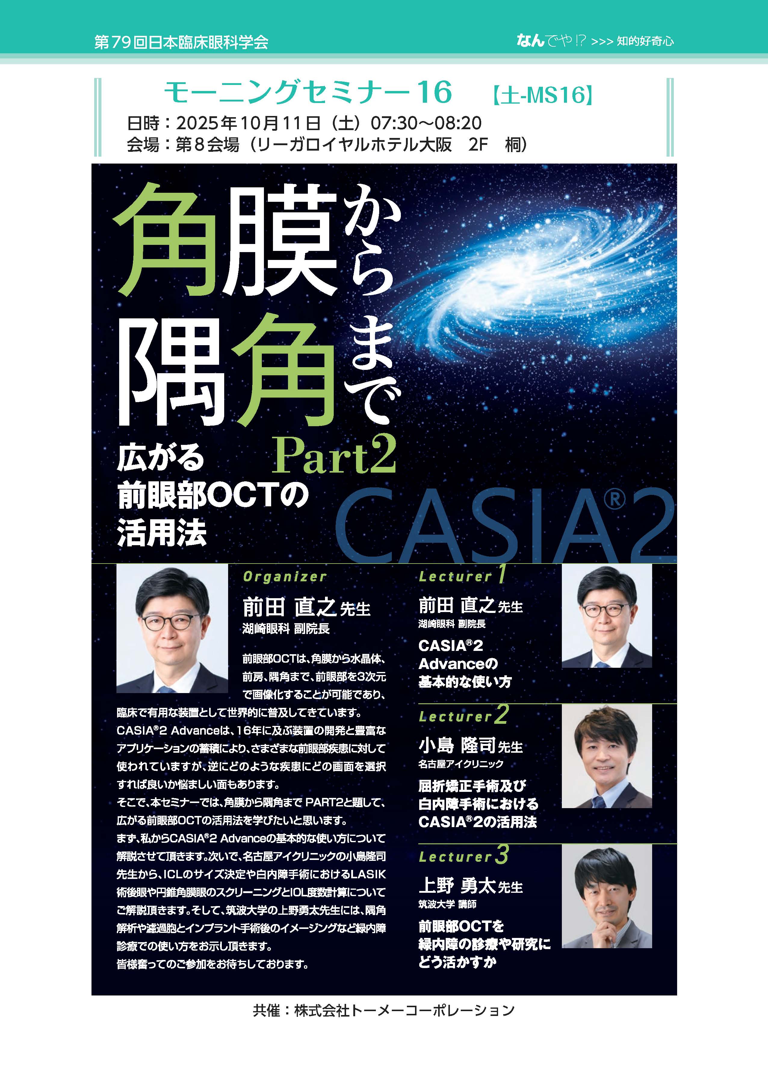 モーニングセミナー 16 角膜から隅角まで PART2 広がる前眼部OCTの活用法 2025年10月11日(土) 7:30 - 8:20 第8会場 | リーガロイヤルホテル大阪 2F 桐 共催:株式会社トーメーコーポレーション |
