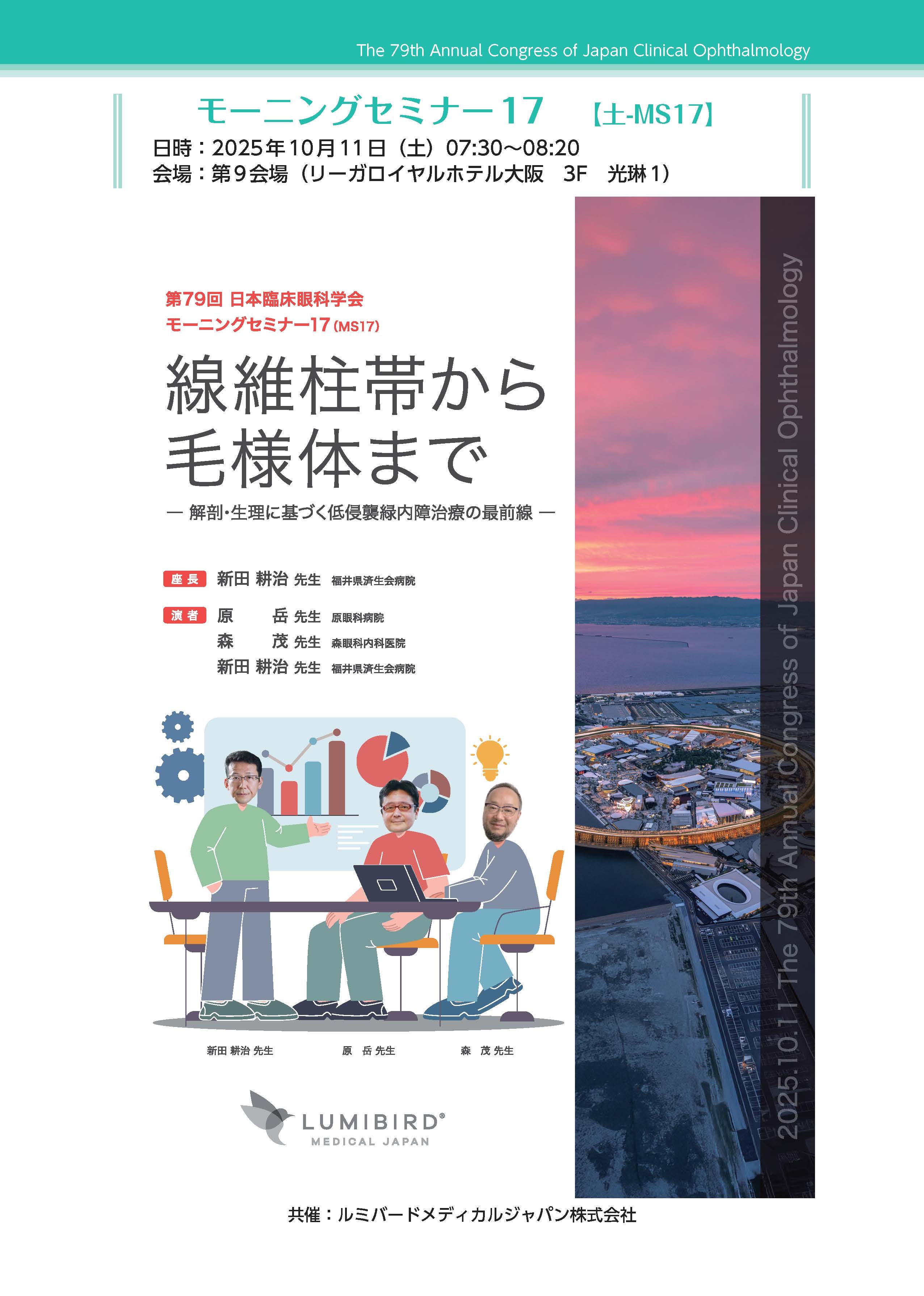 モーニングセミナー 17 線維柱帯から毛様体まで ― 解剖・生理に基づく低侵襲緑内障治療の最前線― 2025年10月11日(土) 7:30 - 8:20 第9会場 | リーガロイヤルホテル大阪 3F 光琳1 共催:ルミバードメディカルジャパン株式会社 |