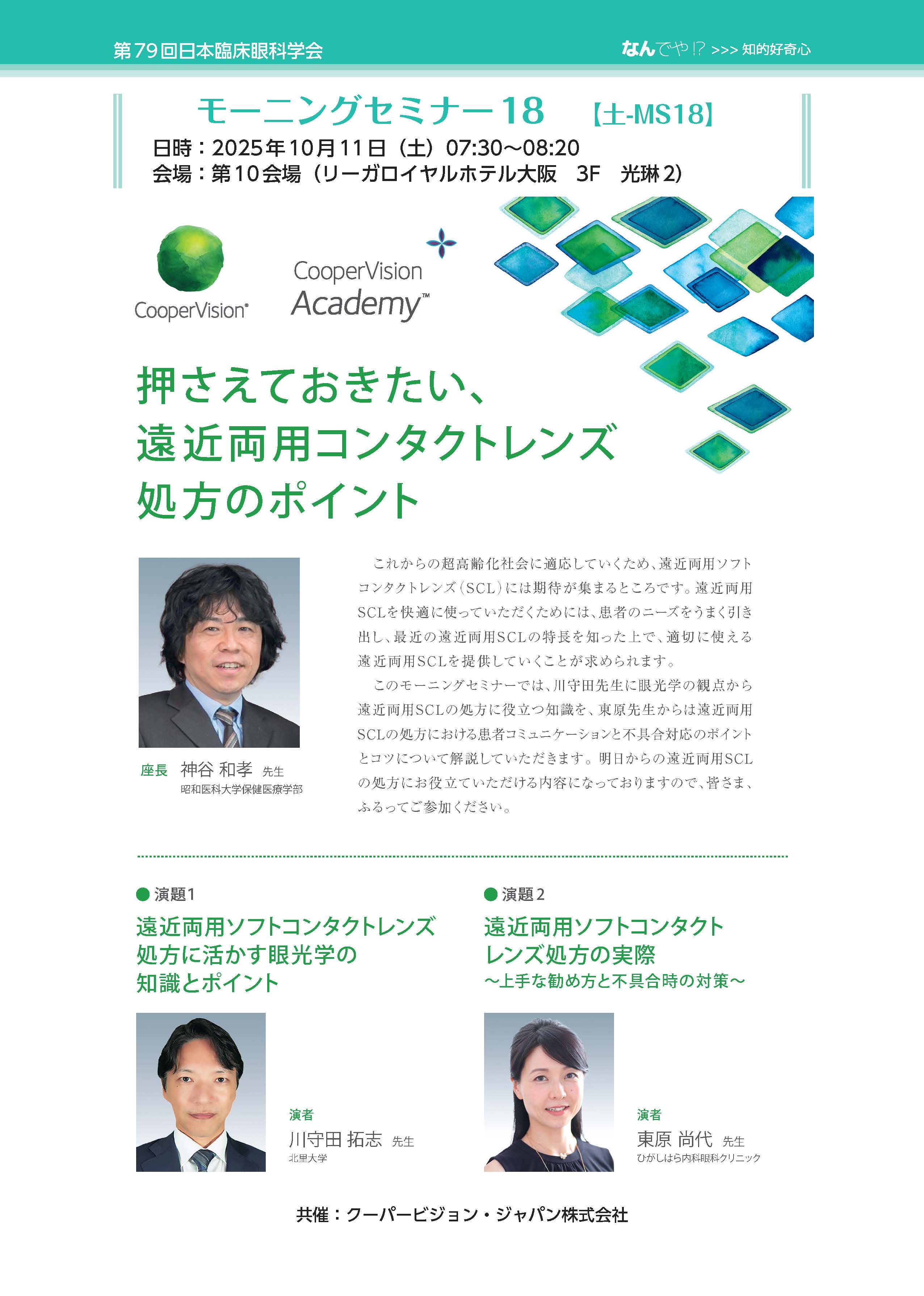モーニングセミナー 18 押さえておきたい、遠近両用コンタクトレンズ処方のポイント 2025年10月11日(土) 7:30 - 8:20 第10会場 | リーガロイヤルホテル大阪 3F 光琳2 共催:クーパービジョン・ジャパン株式会社 |