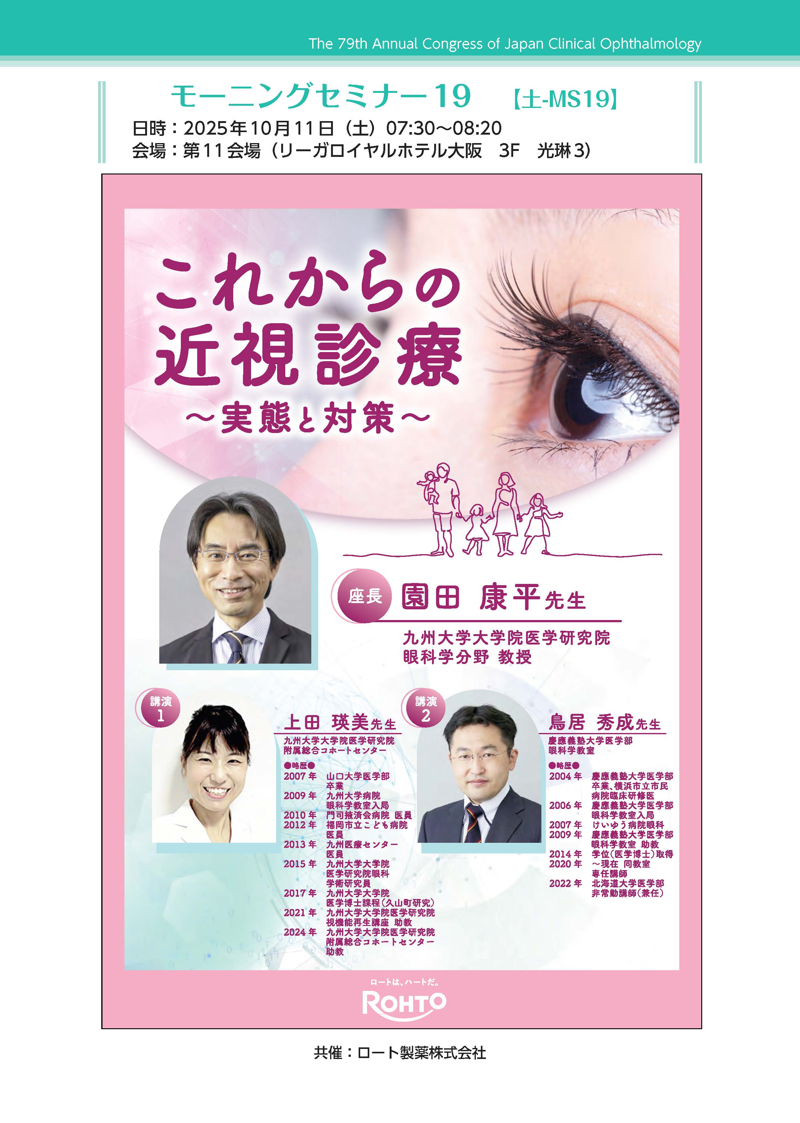 モーニングセミナー 19 これからの近視診療 ~実態と対策~ 2025年10月11日(土) 7:30 - 8:20 第11会場 | リーガロイヤルホテル大阪 3F 光琳3 共催:ロート製薬株式会社 |