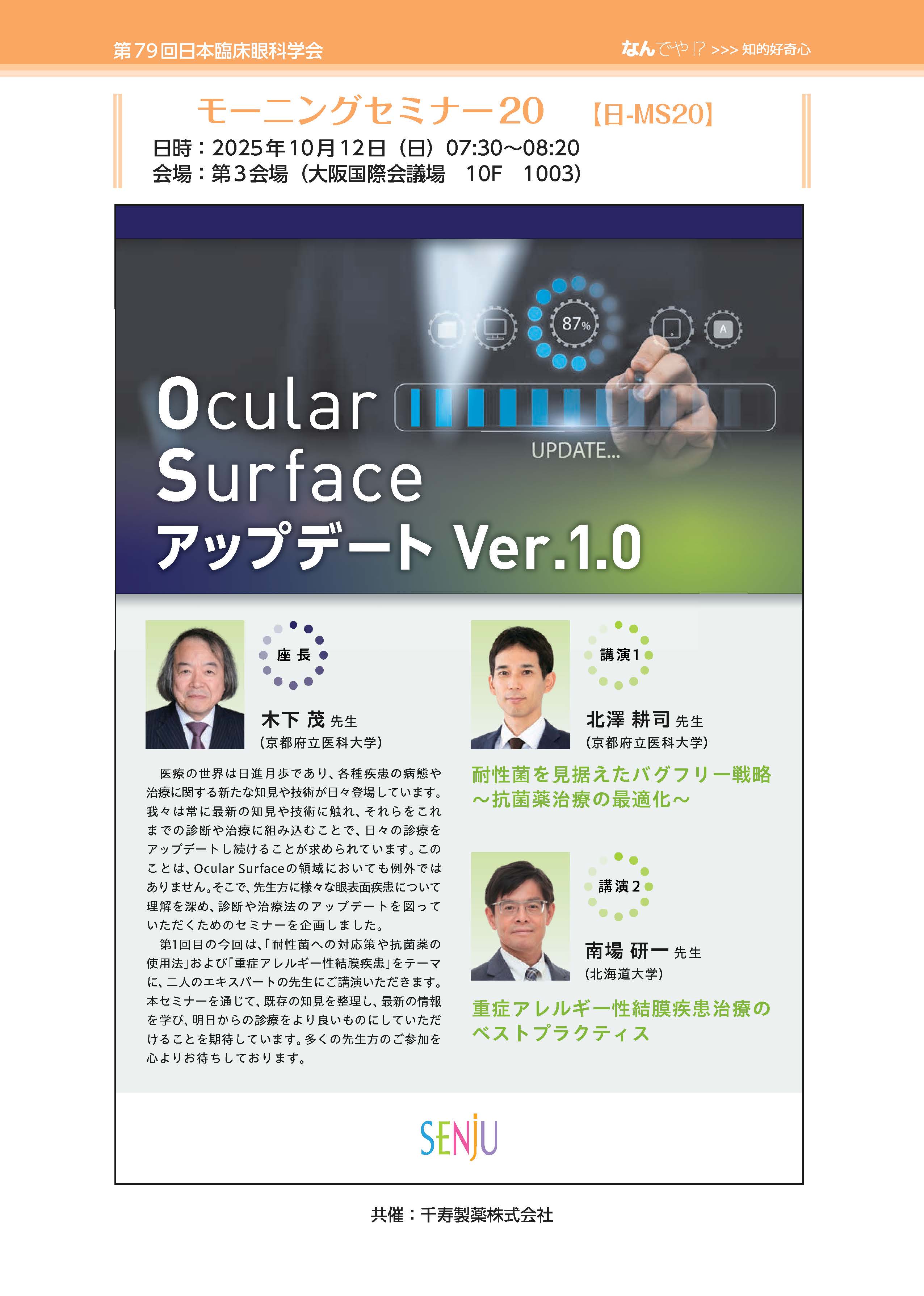 モーニングセミナー 20 Ocular Surfaceアップデート Ver.1.0 2025年10月12日(日) 7:30 - 8:20 第3会場 | 大阪国際会議場 10F 1003 共催:千寿製薬株式会社 |