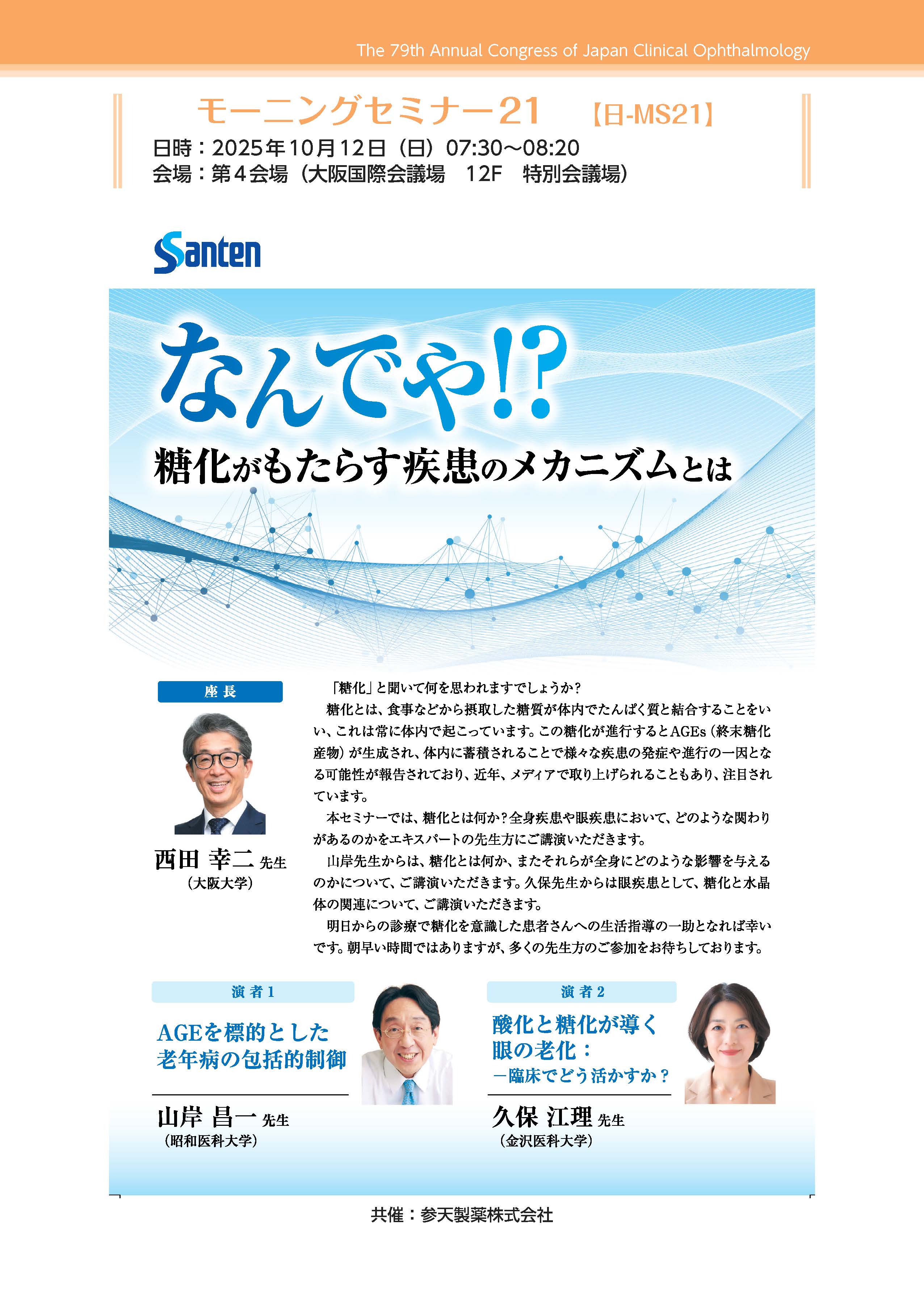 モーニングセミナー 21 なんでや!?糖化がもたらす疾患のメカニズムとは 2025年10月12日(日) 7:30 - 8:20 第4会場 | 大阪国際会議場 12F 特別会議場 共催:参天製薬株式会社 |