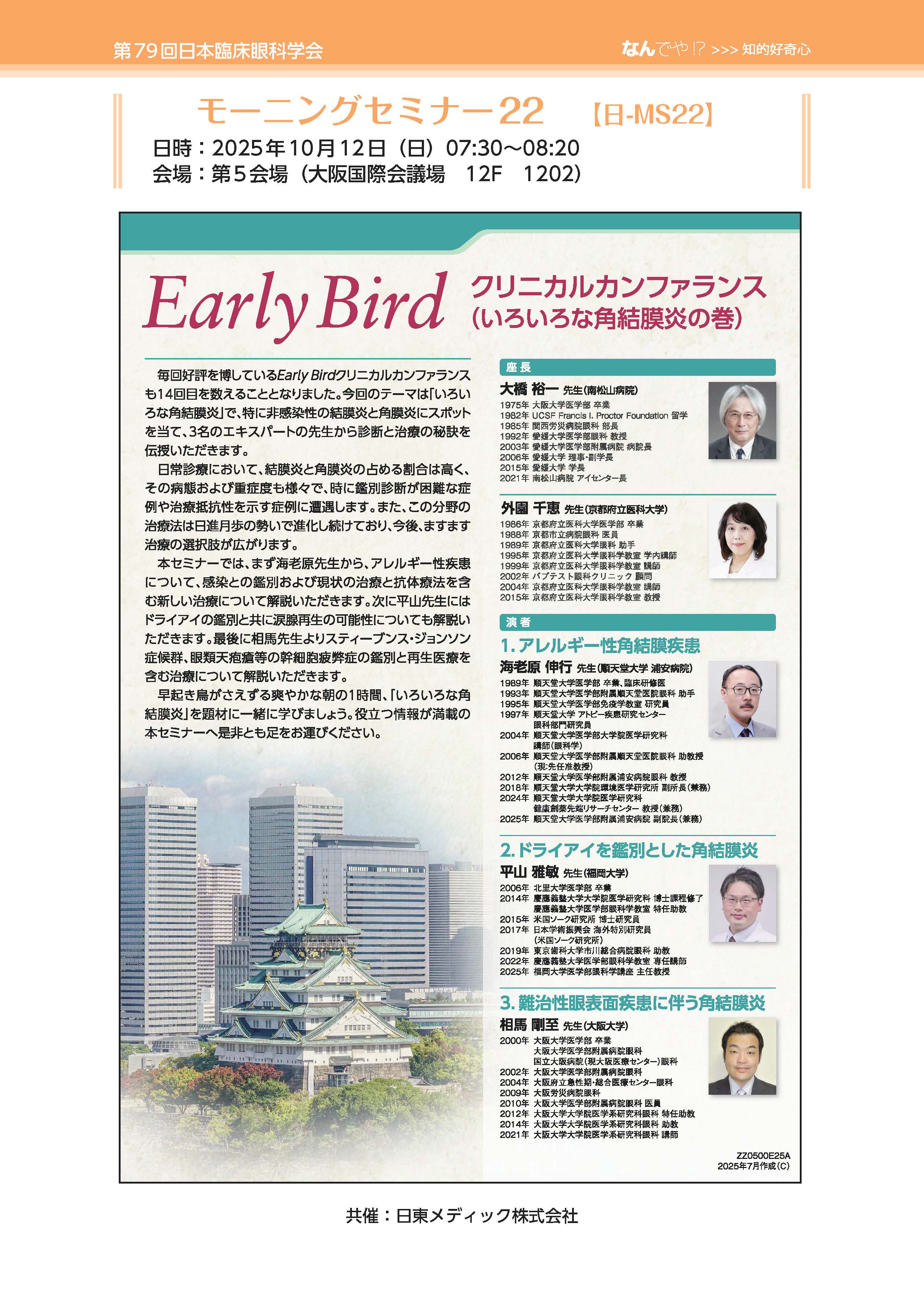 モーニングセミナー 22 Early Bird クリニカルカンファランス(いろいろな角結膜炎の巻) 2025年10月12日(日) 7:30 - 8:20 第5会場 | 大阪国際会議場 12F 1202 共催:日東メディック株式会社 |