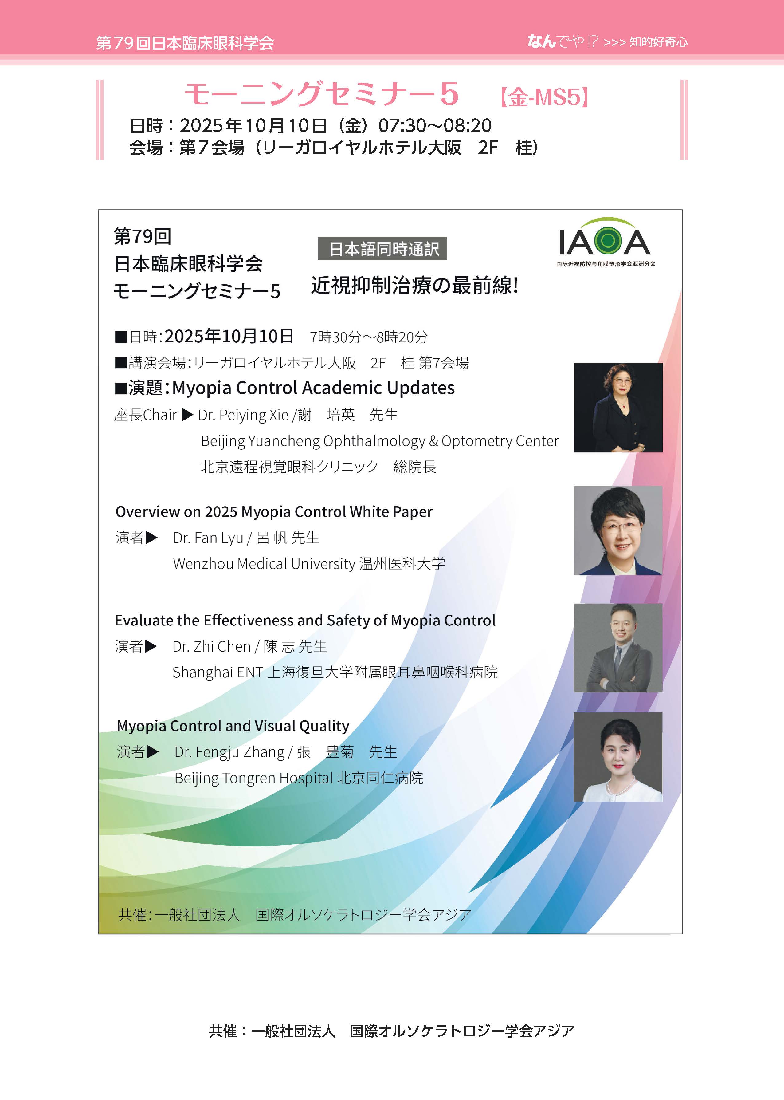モーニングセミナー 5 近視抑制治療の最前線! Myopia Control Academic Updates 2025年10月10日(金) 7:30 - 8:20 第7会場 | リーガロイヤルホテル大阪 2F 桂 共催:一般社団法人 国際オルソケラトロジー学会アジア |