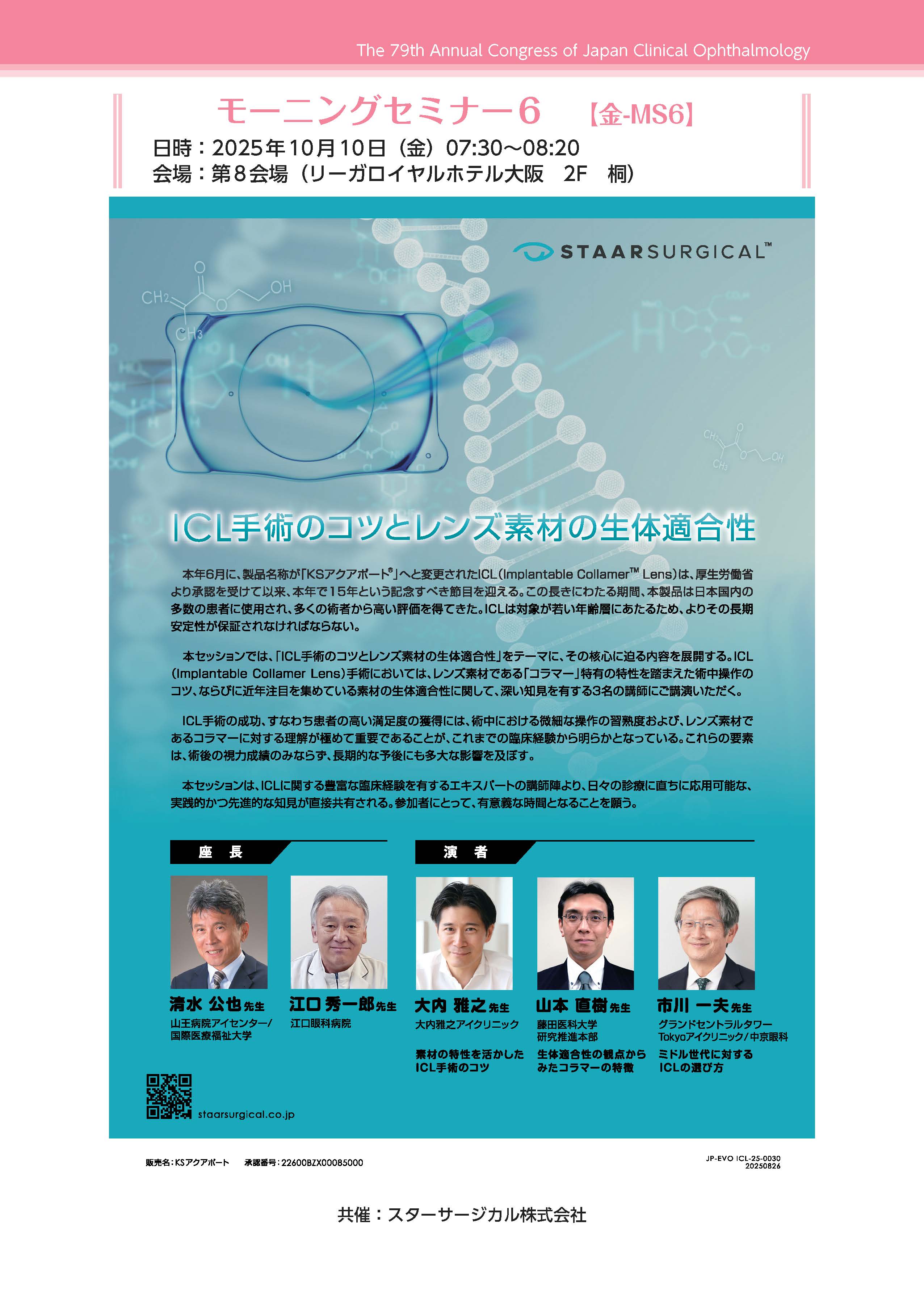 モーニングセミナー 6 ICL手術のコツとレンズ素材の生体適合性 2025年10月10日(金) 7:30 - 8:20 第8会場 | リーガロイヤルホテル大阪 2F 桐 共催:スターサージカル株式会社 |