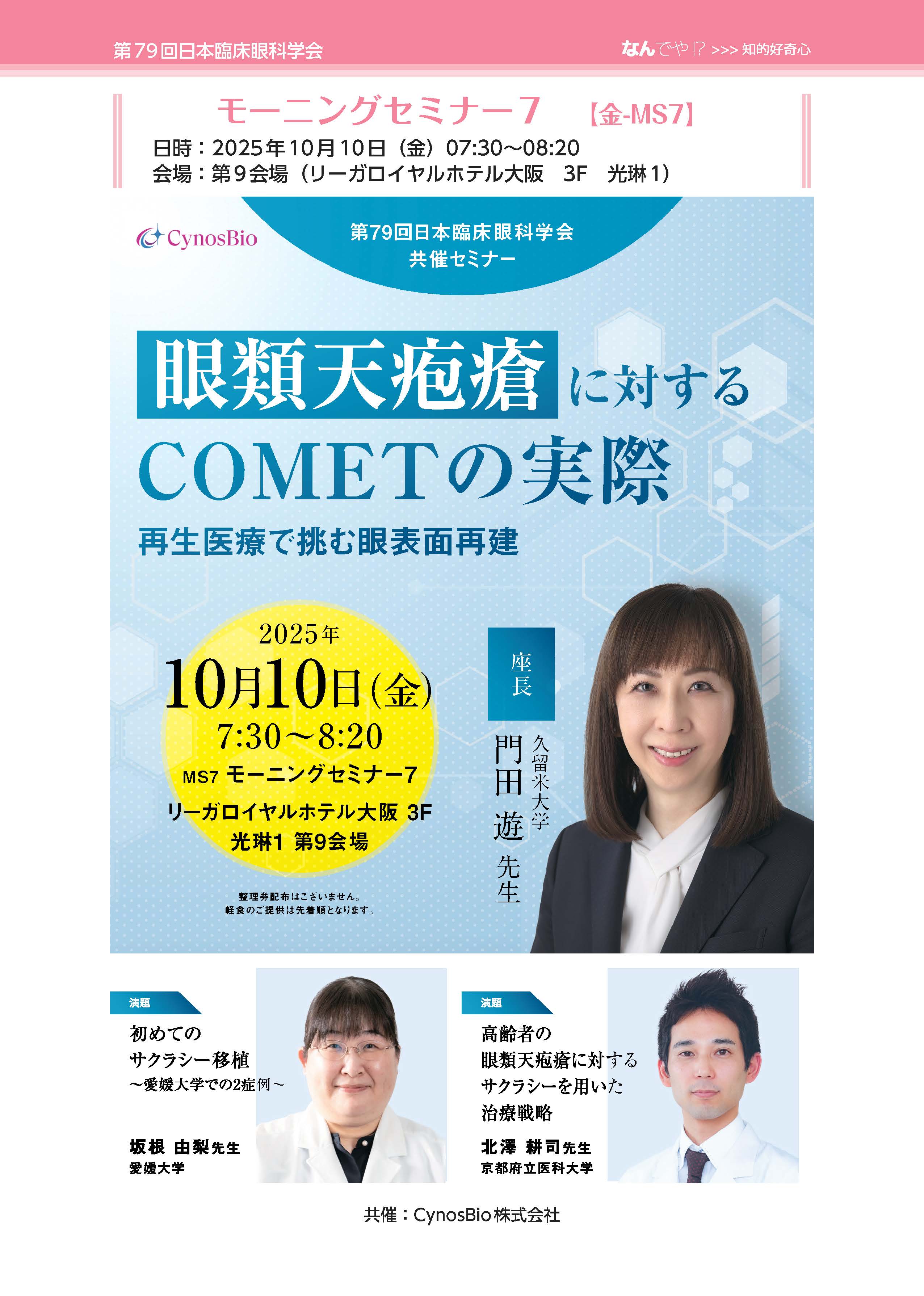 モーニングセミナー 7 眼類天疱瘡に対するCOMETの実際 再生医療で挑む眼表面再建 2025年10月10日(金) 7:30 - 8:20 第9会場 | リーガロイヤルホテル大阪 3F 光琳1 共催:CynosBio株式会社 |