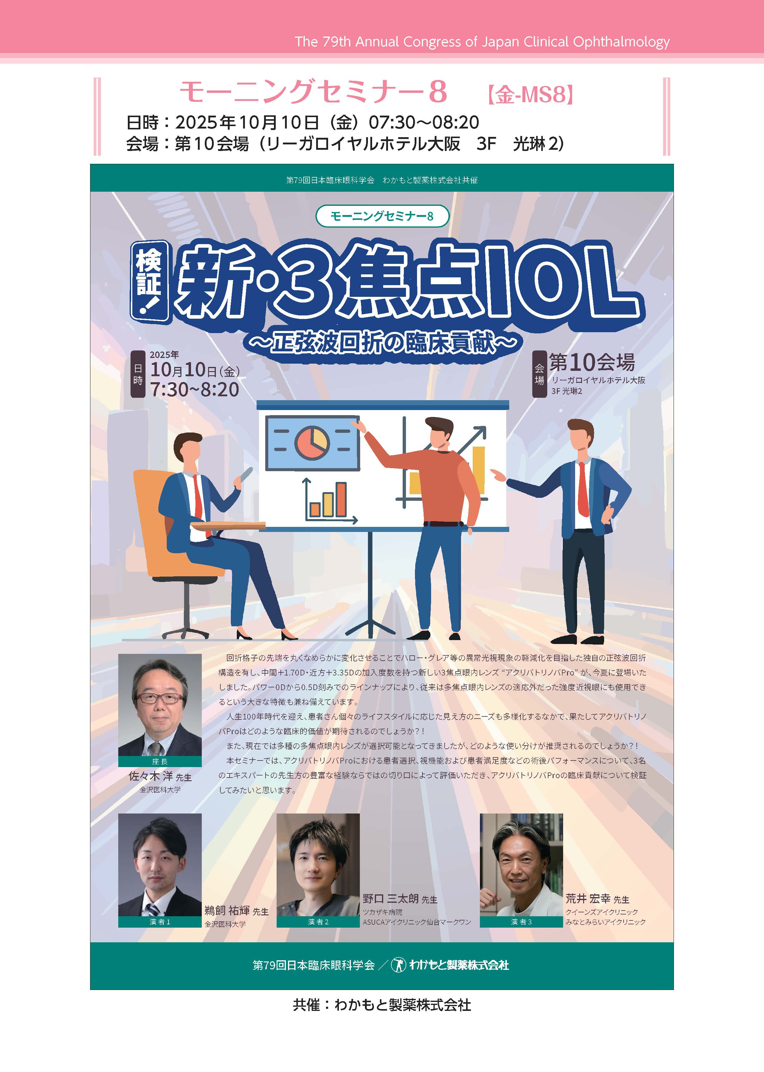 モーニングセミナー 8 検証! 新・3焦点IOL ~正弦波回折の臨床貢献~ 2025年10月10日(金) 7:30 - 8:20 第10会場 | リーガロイヤルホテル大阪 3F 光琳2 共催:わかもと製薬株式会社 |