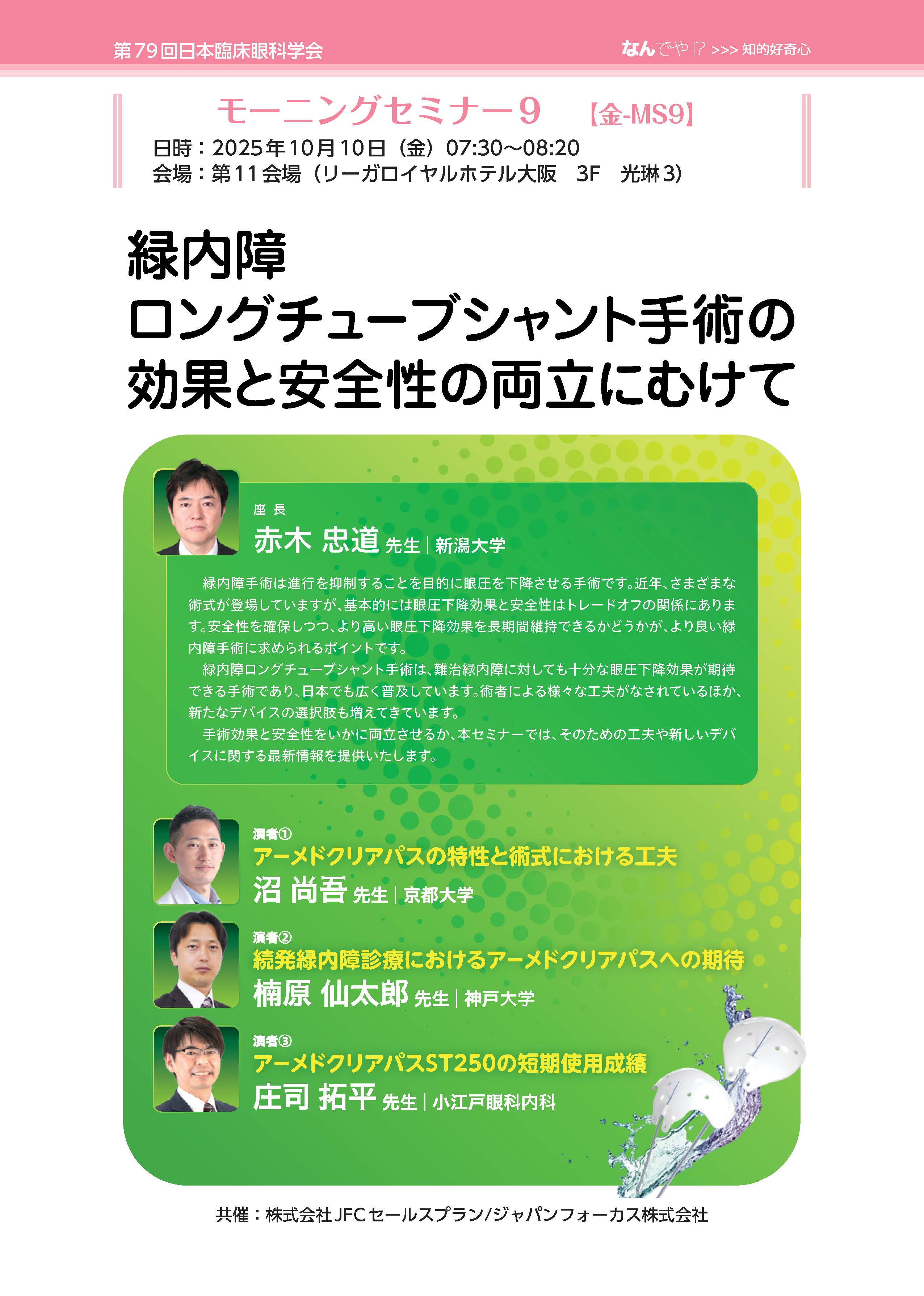 モーニングセミナー 9 緑内障ロングチューブシャント手術の効果と安全性の両立にむけて 2025年10月10日(金) 7:30 - 8:20 第11会場 | リーガロイヤルホテル大阪 3F 光琳3 共催:株式会社JFCセールスプラン/ジャパンフォーカス株式会社 |