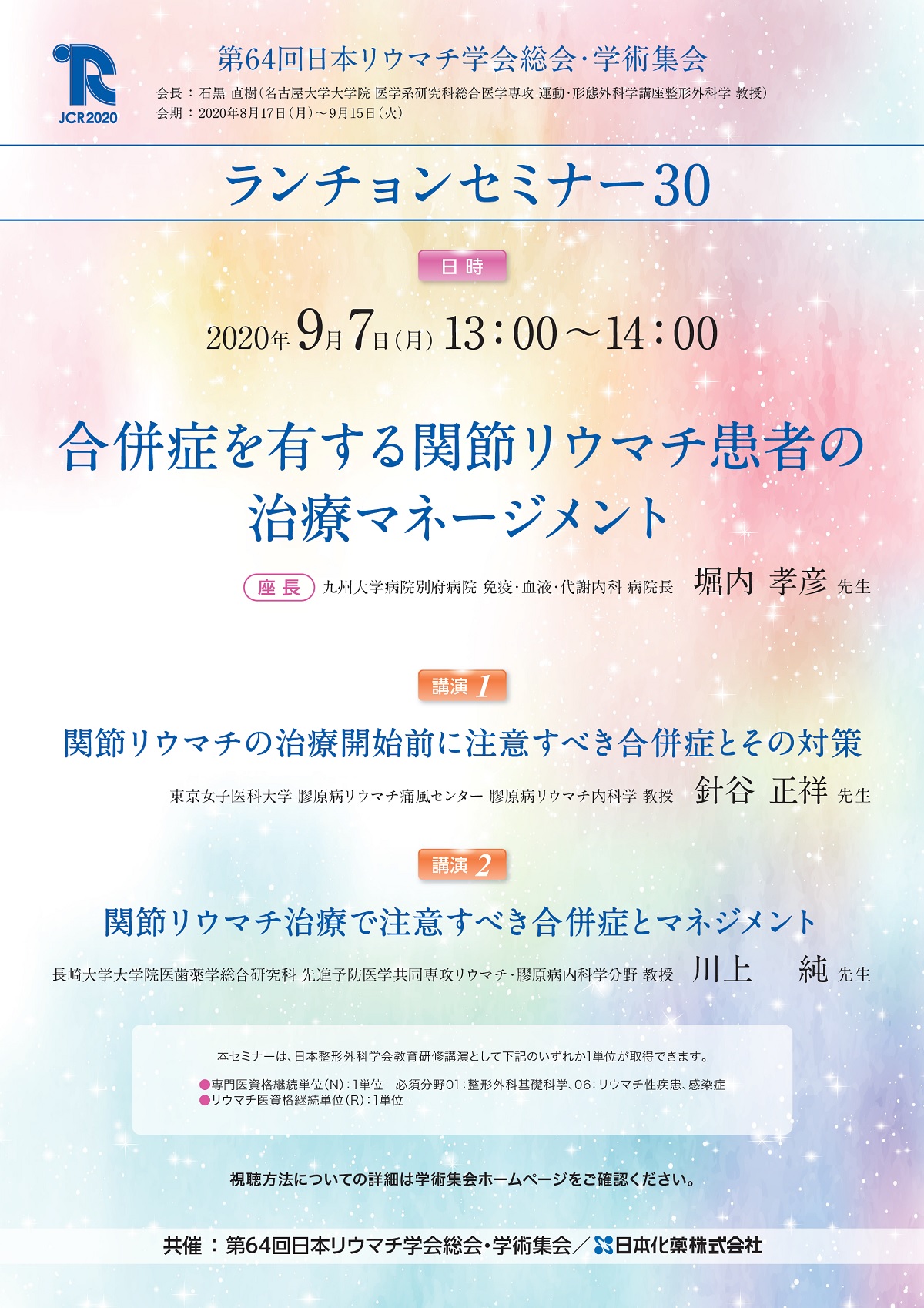 【LIVE 9/7 配信】 ランチョンセミナー30 合併症を有する関節リウマチ患者の治療マネージメント―より高いQOL向上を目指して― 共催:日本化薬株式会社 |