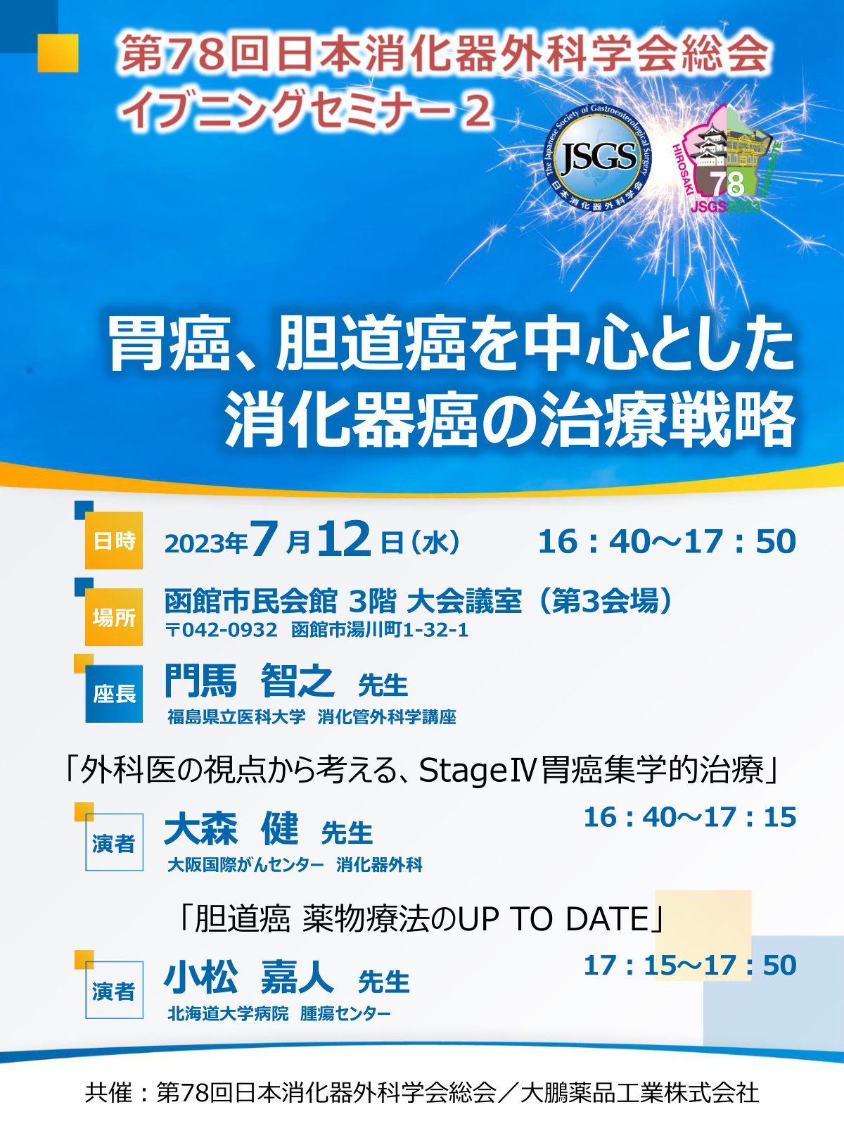 イブニングセミナー2 胃癌、胆道癌を中心とした消化器癌の治療戦略 2023年7月12日(水) 16:40 - 17:50 第3会場 | 函館市民会館 3階 大会議室 共催:大鵬薬品工業株式会社 |
