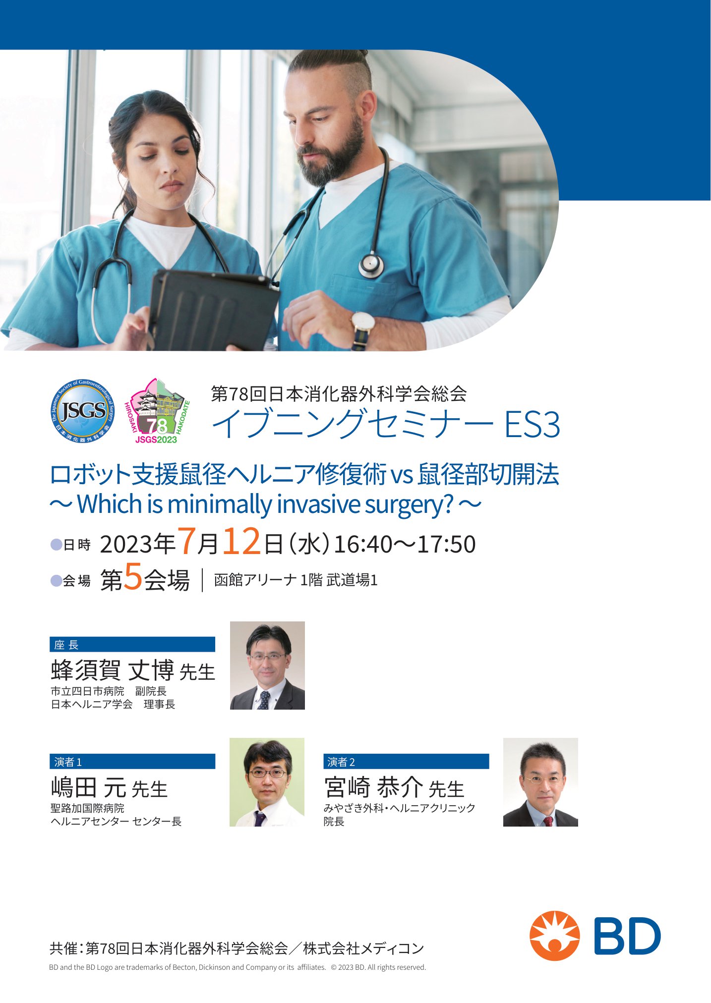 イブニングセミナー3 ロボット支援鼠径ヘルニア修復術 vs 鼠径部切開法 ~ Which is minimally invasive surgery? ~ 2023年7月12日(水) 16:40 - 17:50 第5会場 | 函館アリーナ 1階 武道場1 共催:株式会社メディコン |
