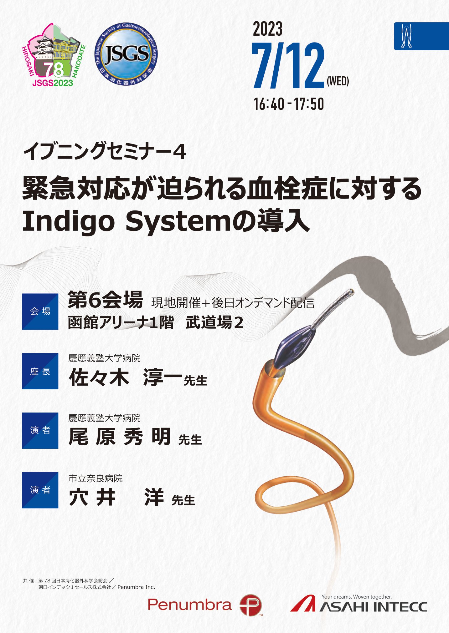 イブニングセミナー4 緊急対応が迫られる血栓症に対するIndigo Systemの導入 2023年7月12日(水) 16:40 - 17:50 第6会場 | 函館アリーナ 1階 武道場2 共催:朝日インテックJセールス株式会社 |