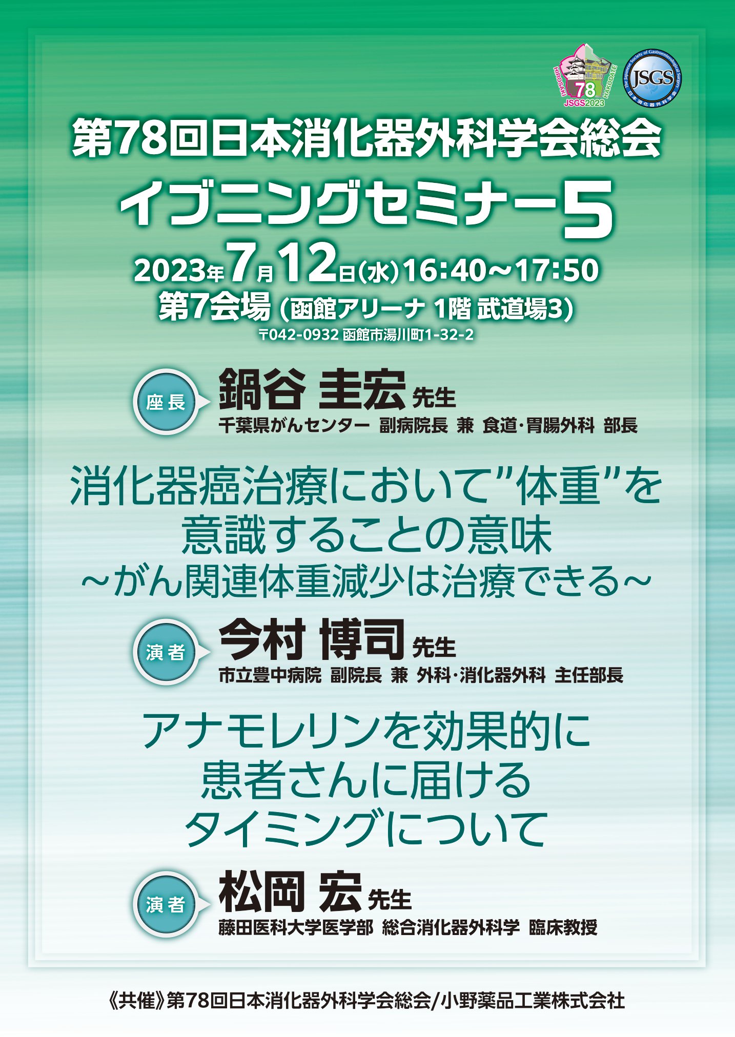 イブニングセミナー5 消化器癌治療において”体重”を意識することの意味 ~がん関連体重減少は治療できる~/アナモレリンを効果的に患者さんに届けるタイミング 2023年7月12日(水) 16:40 - 17:50 第7会場 | 函館アリーナ 1階 武道場3 共催:小野薬品工業株式会社 |