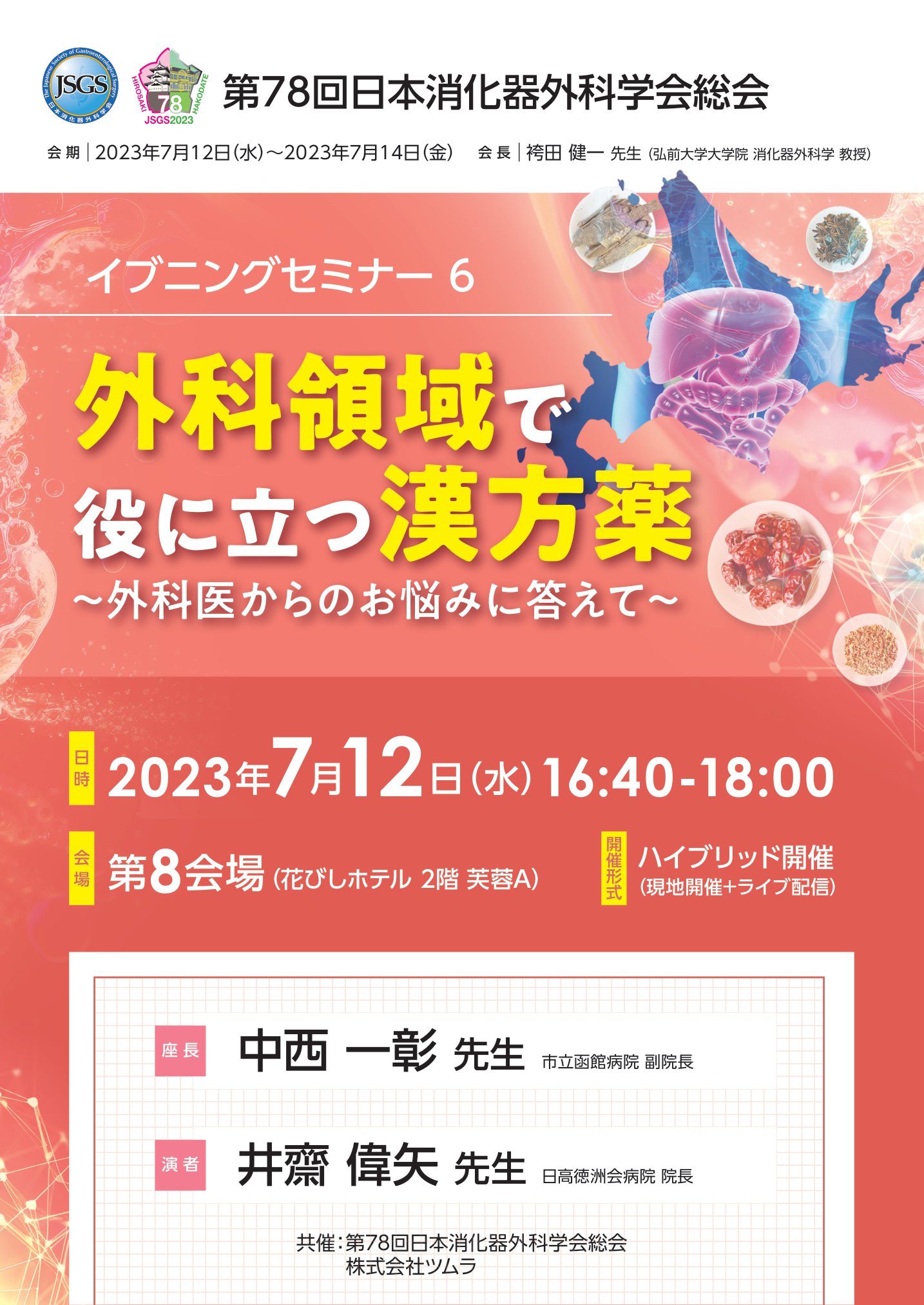 イブニングセミナー6 外科領域で役に立つ漢方薬~外科医からのお悩みに答えて~ 2023年7月12日(水) 16:40 - 18:00 第8会場 | 花びしホテル 2階 芙蓉A 共催:株式会社ツムラ |