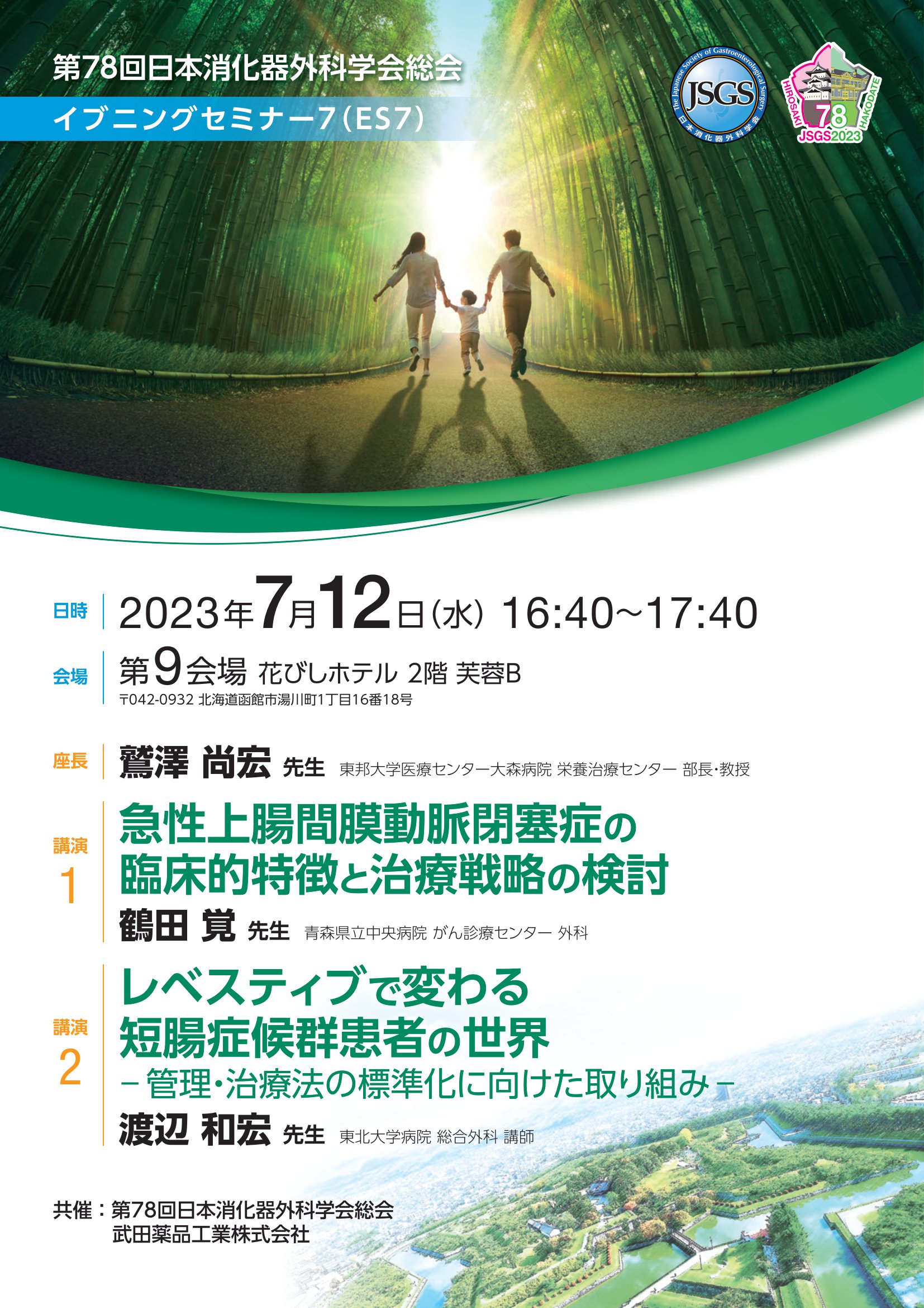 イブニングセミナー7 急性上腸間膜動脈閉塞症の臨床的特徴と治療戦略の検討/レベスティブで変わる短腸症候群患者の世界 -管理・治療法の標準化に向けた取り組み- 2023年7月12日(水) 16:40 - 17:40 第9会場 | 花びしホテル 2階 芙蓉B 共催:武田薬品工業株式会社 |