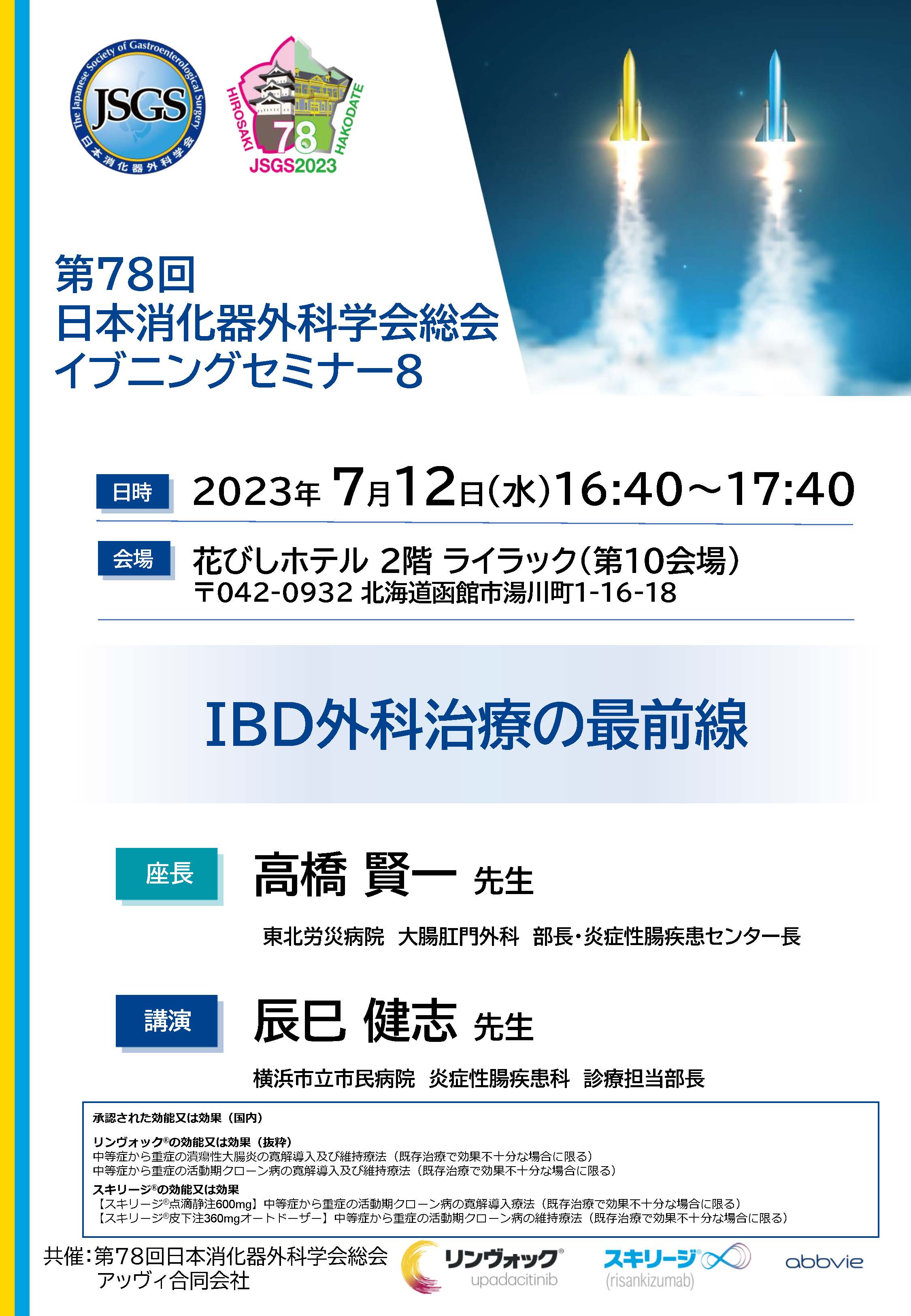 イブニングセミナー8 IBD外科治療の最前線 2023年7月12日(水) 16:40 - 17:40 第10会場 | 花びしホテル 2階 ライラック 共催:アッヴィ合同会社 |