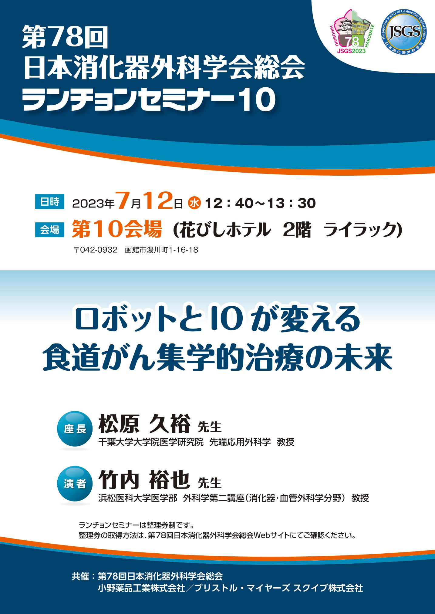 ランチョンセミナー10 ロボットとIOが変える食道がん集学的治療の未来 2023年7月12日(水) 12:40 - 13:30 第10会場 | 花びしホテル 2階 ライラック 共催:小野薬品工業株式会社/ブリストル・マイヤーズスクイブ株式会社 |