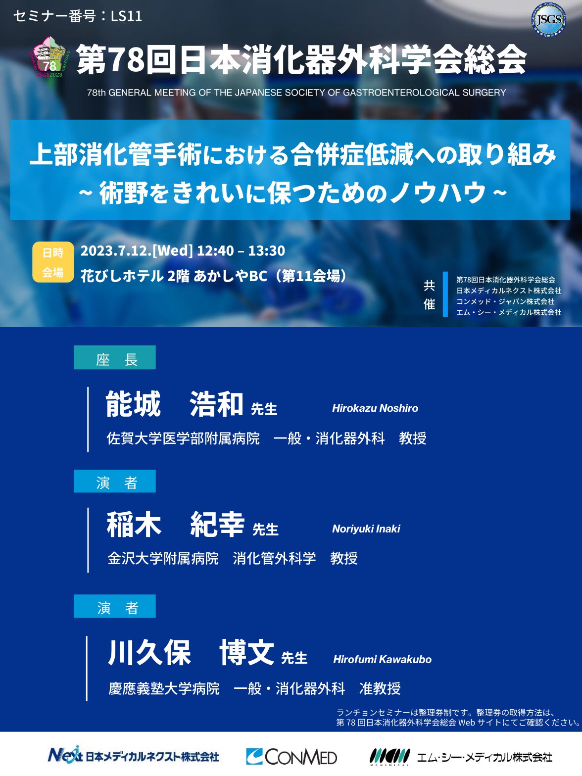 ランチョンセミナー11 上部消化管手術における合併症低減への取り組み~術野をきれいに保つためのノウハウ~ 2023年7月12日(水) 12:40 - 13:30 第11会場 | 花びしホテル 2階 あかしやBC 共催:日本メディカルネクスト株式会社/コンメッド・ジャパン株式会社/エム・シー・メディカル株式会社 |