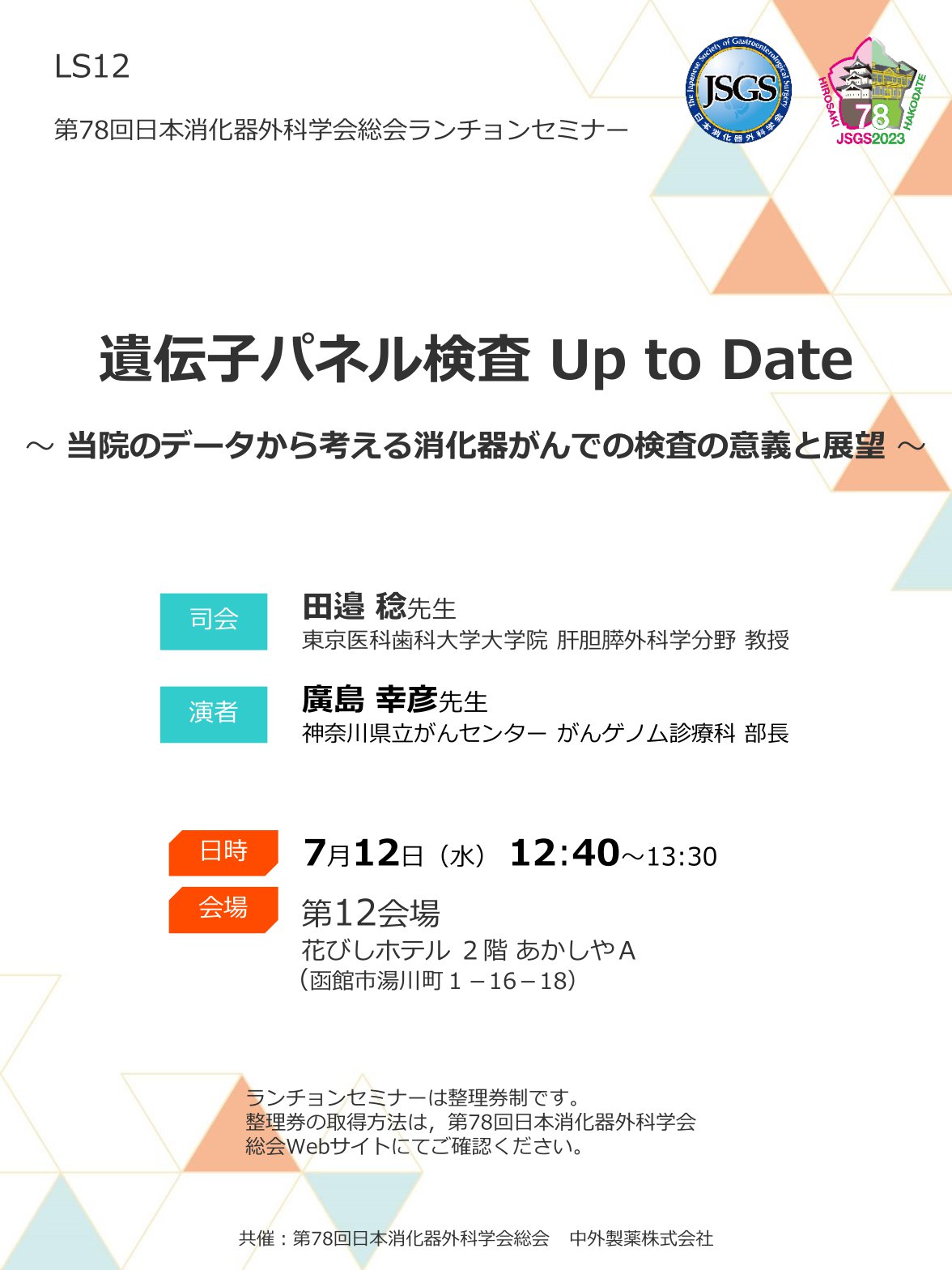 ランチョンセミナー12 遺伝子パネル検査 Up to Date ~当院のデータから考える消化器がんでの検査の意義と展望~ 2023年7月12日(水) 12:40 - 13:30 第12会場 | 花びしホテル 2階 あかしやA 共催:中外製薬株式会社 |