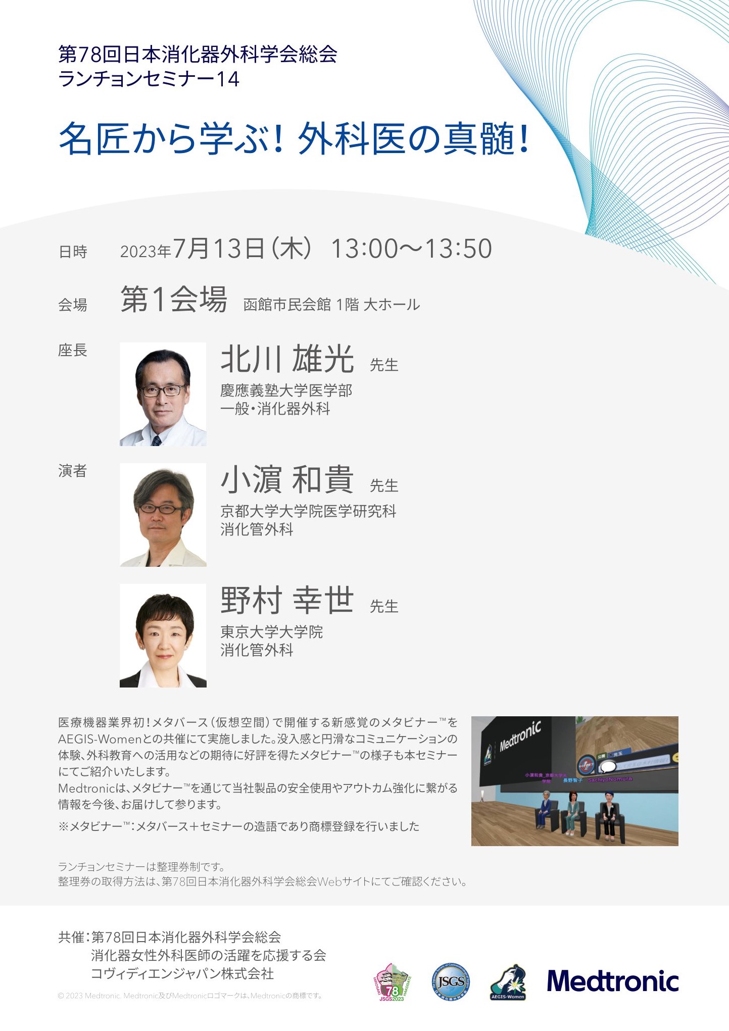 ランチョンセミナー14 名匠から学ぶ!外科医の真髄! 2023年7月13日(木) 13:00 - 13:50 第1会場 | 函館市民会館 1階 大ホール 共催:消化器女性外科医師の活躍を応援する会/コヴィディエンジャパン株式会社 |