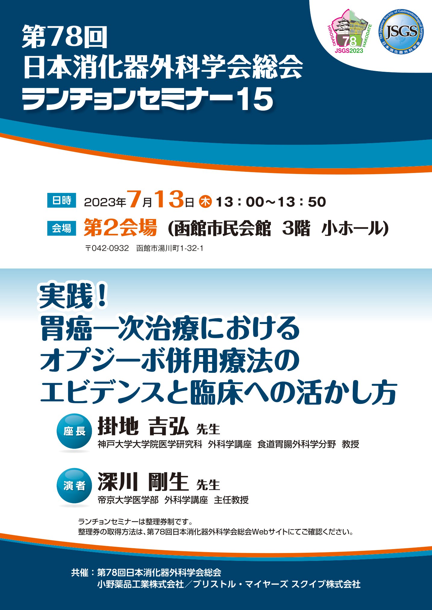 ランチョンセミナー15 実践!胃癌一次治療におけるオプジーボ併用療法のエビデンスと臨床への活かし方 2023年7月13日(木) 13:00 - 13:50 第2会場 | 函館市民会館 3階 小ホール 共催:小野薬品工業株式会社/ブリストル・マイヤーズスクイブ株式会社 |