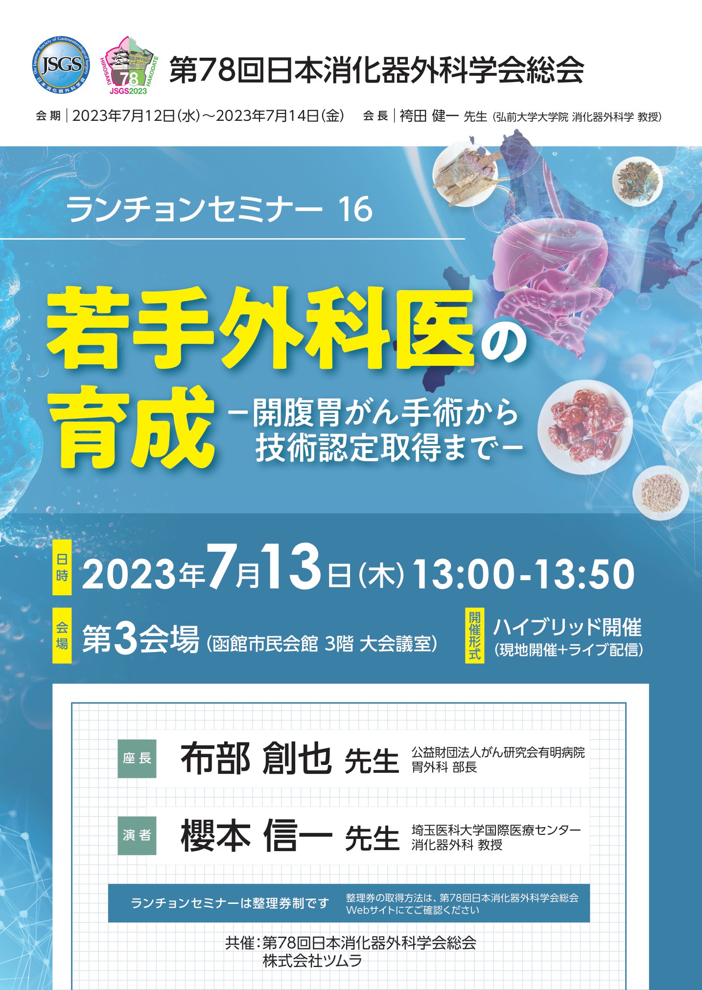 ランチョンセミナー16 若手外科医の育成-開腹胃がん手術から技術認定取得まで- 2023年7月13日(木) 13:00 - 13:50 第3会場 | 函館市民会館 3階 大会議室 共催:株式会社ツムラ |