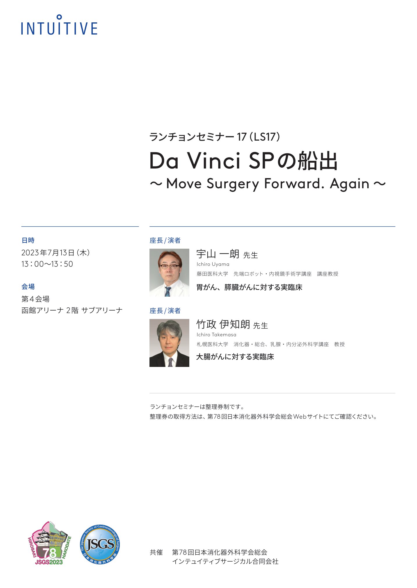 ランチョンセミナー17 Da Vinci SPの船出 ~Move Surgery Forward. Again~ 2023年7月13日(木) 13:00 - 13:50 第4会場 | 函館アリーナ 2階 サブアリーナ 共催:インテュイティブサージカル合同会社 |