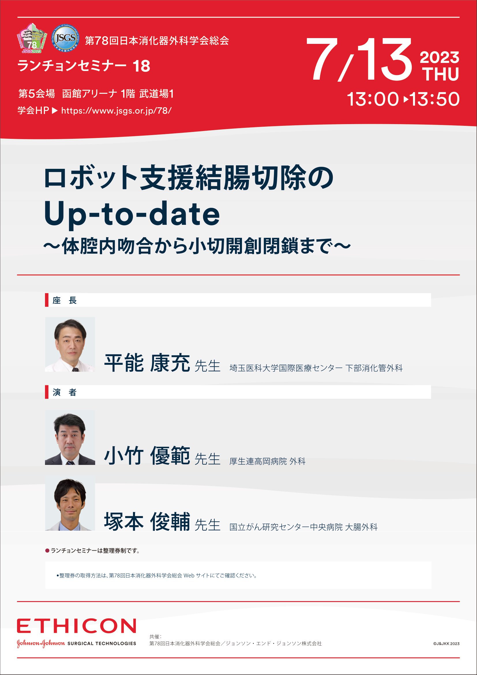 ランチョンセミナー18 ロボット支援結腸切除のUp-to-date ~体腔内吻合から小切開創閉鎖まで~ 2023年7月13日(木) 13:00 - 13:50 第5会場 | 函館アリーナ 1階 武道場1 共催:ジョンソン・エンド・ジョンソン株式会社 |