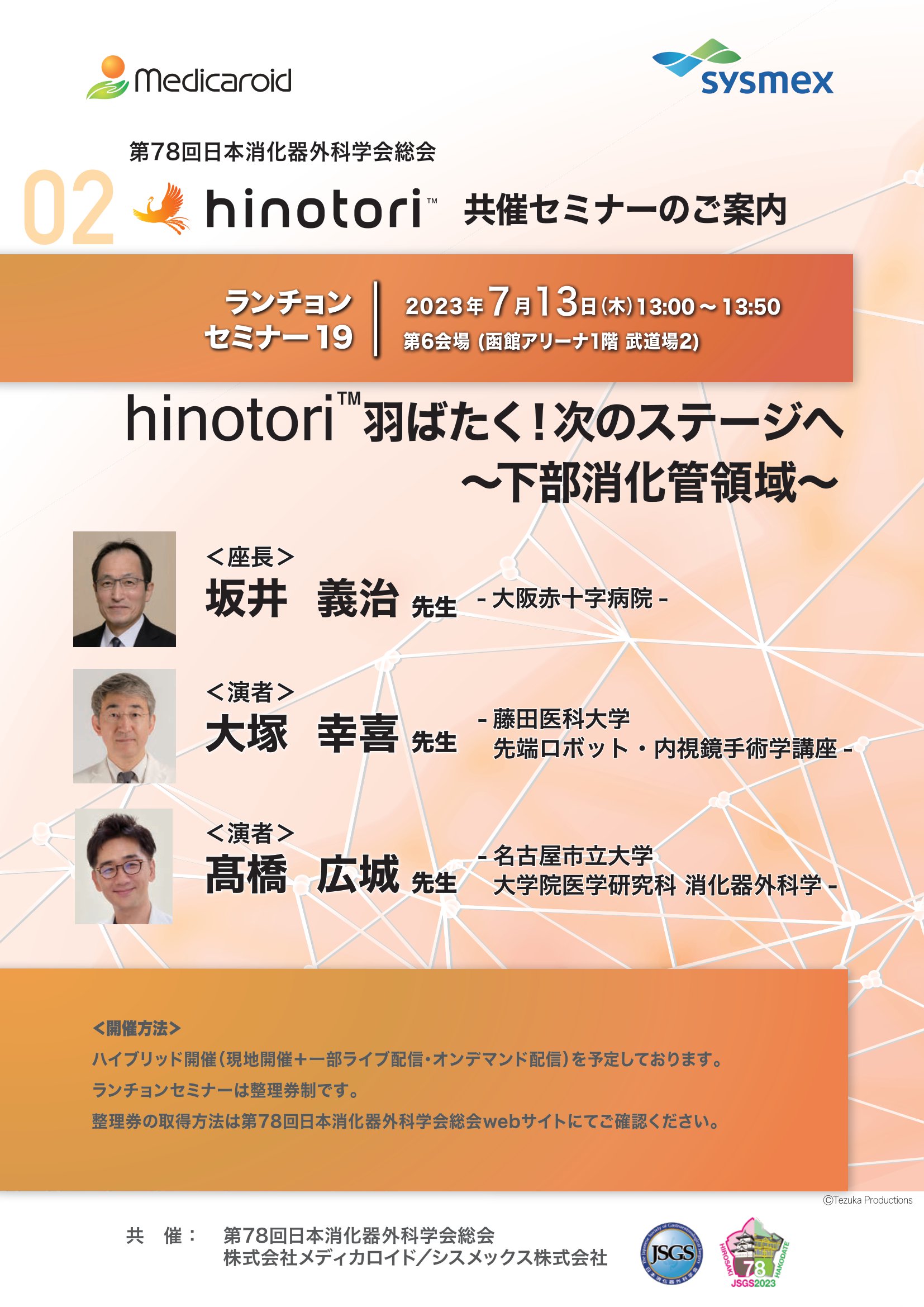 ランチョンセミナー19 hinotori™羽ばたく!次のステージへ~下部消化管領域~ 2023年7月13日(木) 13:00 - 13:50 第6会場 | 函館アリーナ 1階 武道場2 共催:株式会社メディカロイド/シスメックス株式会社 |