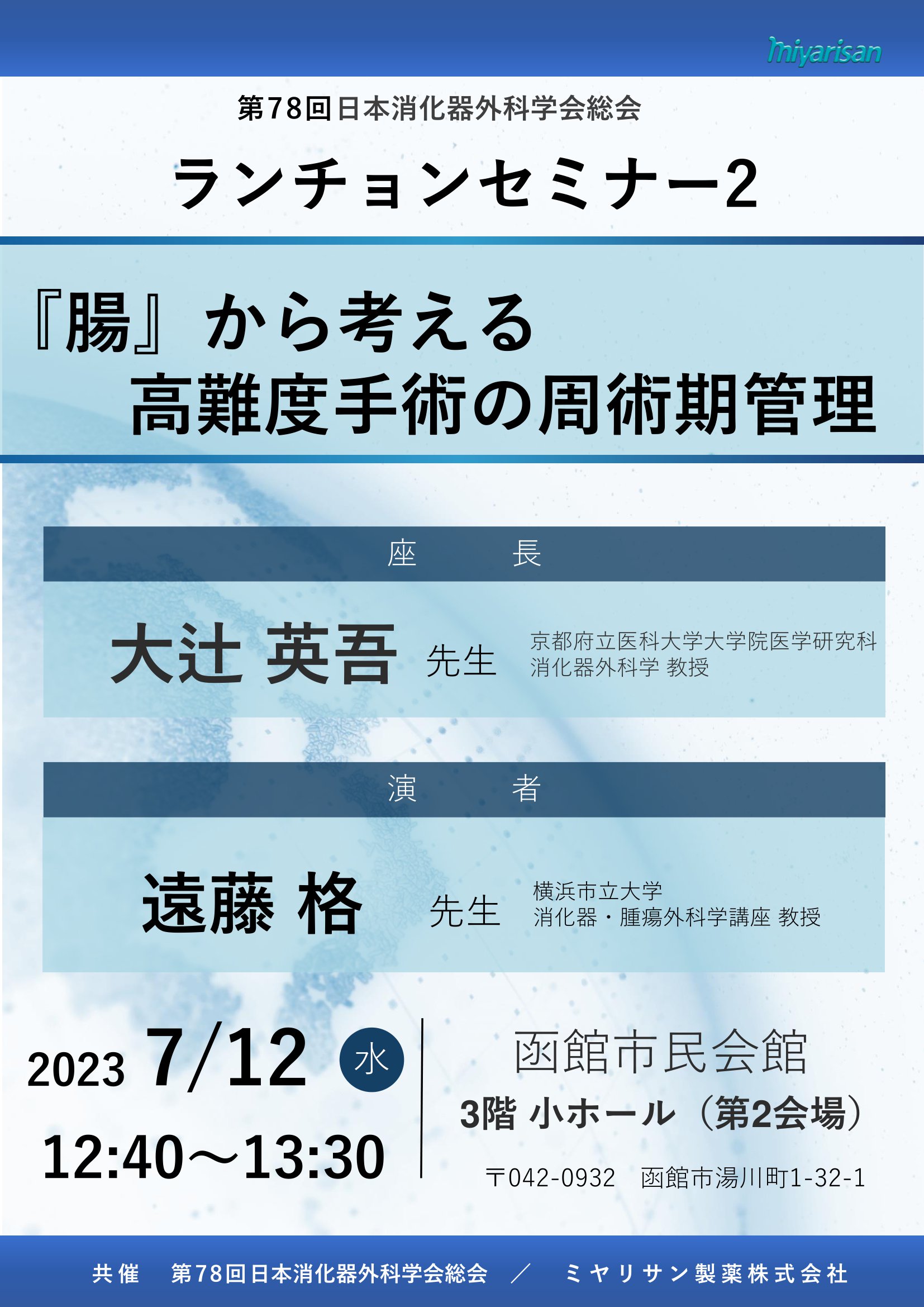 ランチョンセミナー2 『腸』から考える高難度手術の周術期管理 2023年7月12日(水) 12:40 - 13:30 第2会場 | 函館市民会館 3階 小ホール 共催:ミヤリサン製薬株式会社 |