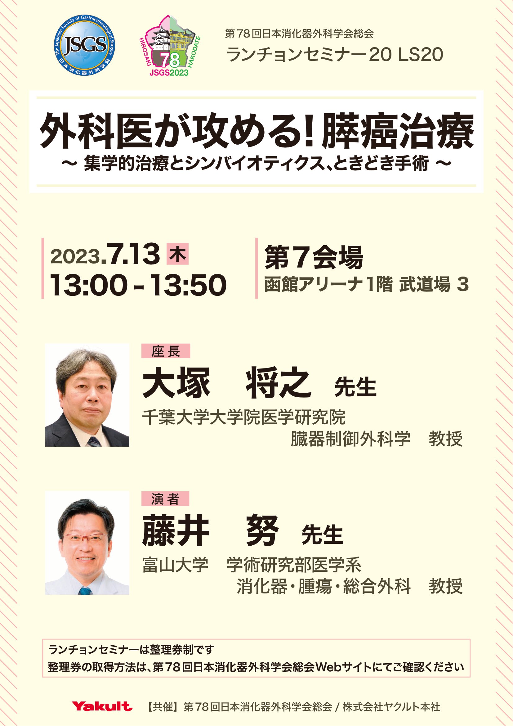 ランチョンセミナー20 外科医が攻める!膵癌治療~集学的治療とシンバイオティクス、ときどき手術~ 2023年7月13日(木) 13:00 - 13:50 第7会場 | 函館アリーナ 1階 武道場3 共催:株式会社ヤクルト本社 |