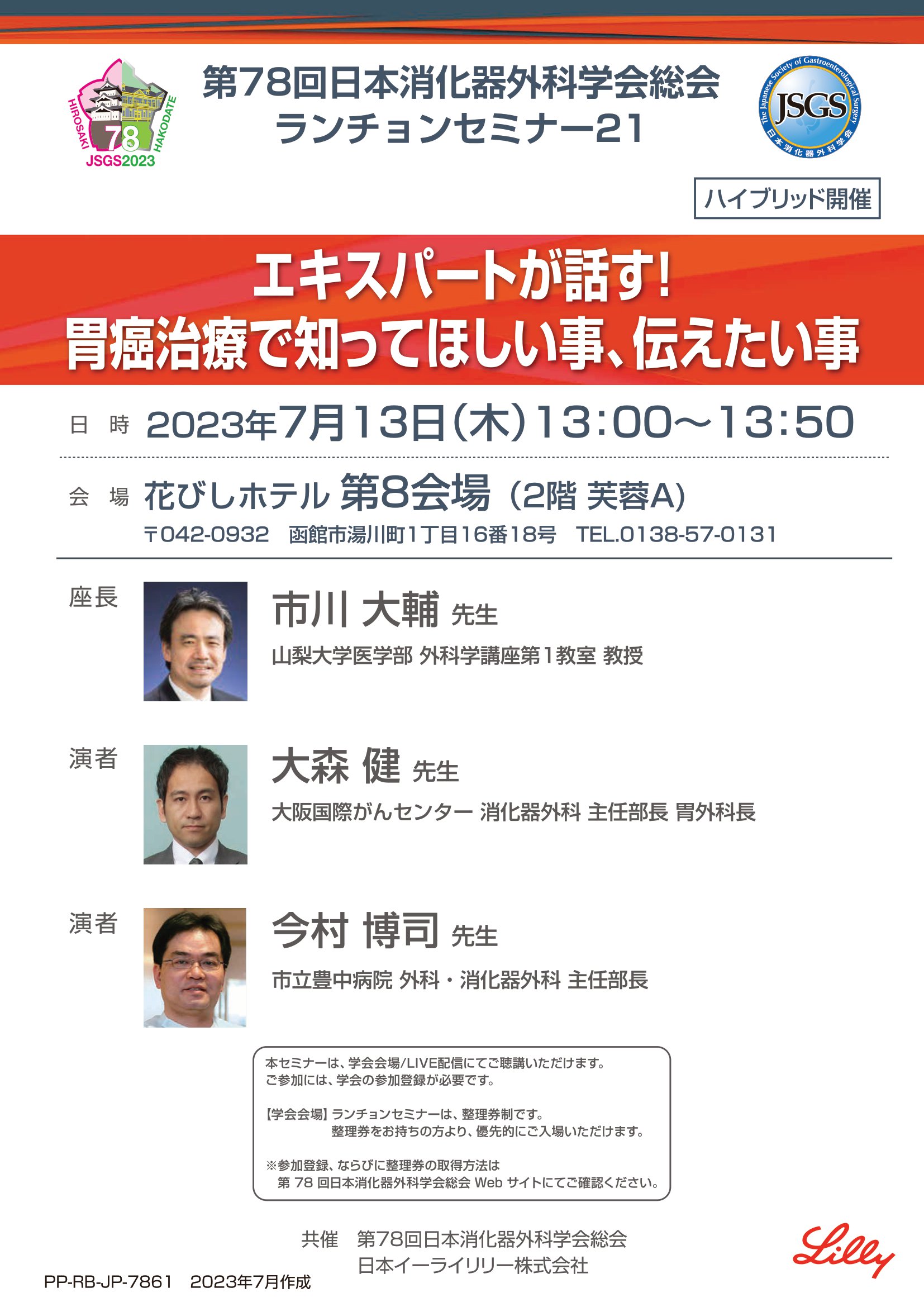 ランチョンセミナー21 エキスパートが話す!胃癌治療で知ってほしい事、伝えたい事 2023年7月13日(木) 13:00 - 13:50 第8会場 | 花びしホテル 2階 芙蓉A 共催:日本イーライリリー株式会社 |