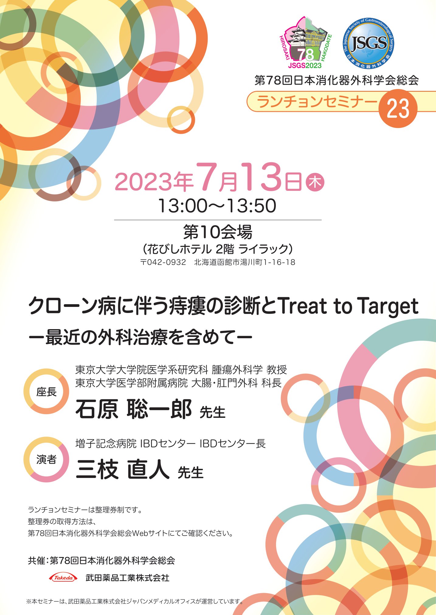 ランチョンセミナー23 クローン病に伴う痔瘻の診断とTreat to Target -最近の外科治療を含めて- 2023年7月13日(木) 13:00 - 13:50 第10会場 | 花びしホテル 2階 ライラック 共催:武田薬品工業株式会社 ジャパンメディカルオフィス |