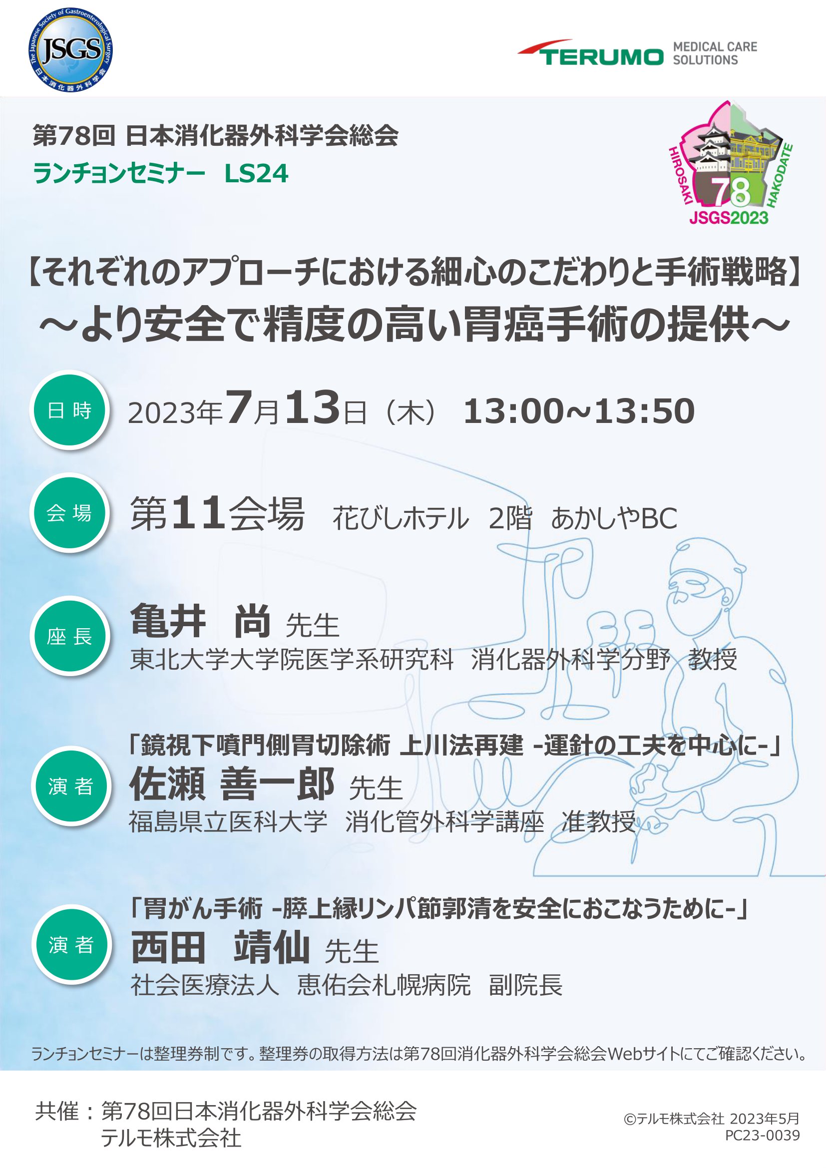 ランチョンセミナー24 【それぞれのアプローチにおける細心のこだわりと手術戦略】〜より安全で精度の高い胃癌手術の提供〜 2023年7月13日(木) 13:00 - 13:50 第11会場 | 花びしホテル 2階 あかしやBC 共催:テルモ株式会社 |