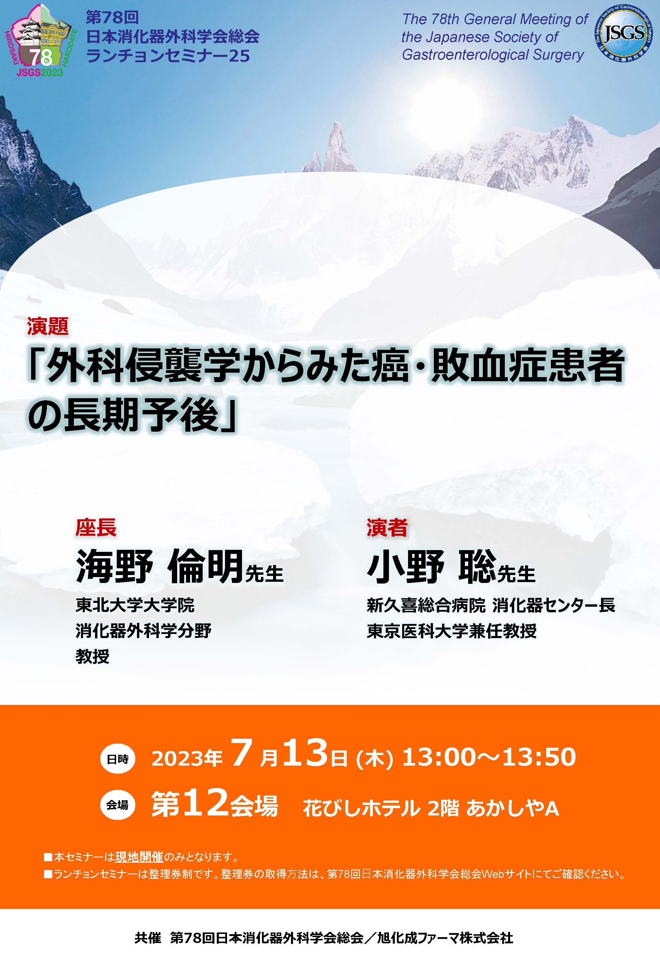 ランチョンセミナー25 外科侵襲学からみた癌・敗血症患者の長期予後 2023年7月13日(木) 13:00 - 13:50 第12会場 | 花びしホテル 2階 あかしやA 共催:旭化成ファーマ株式会社 |