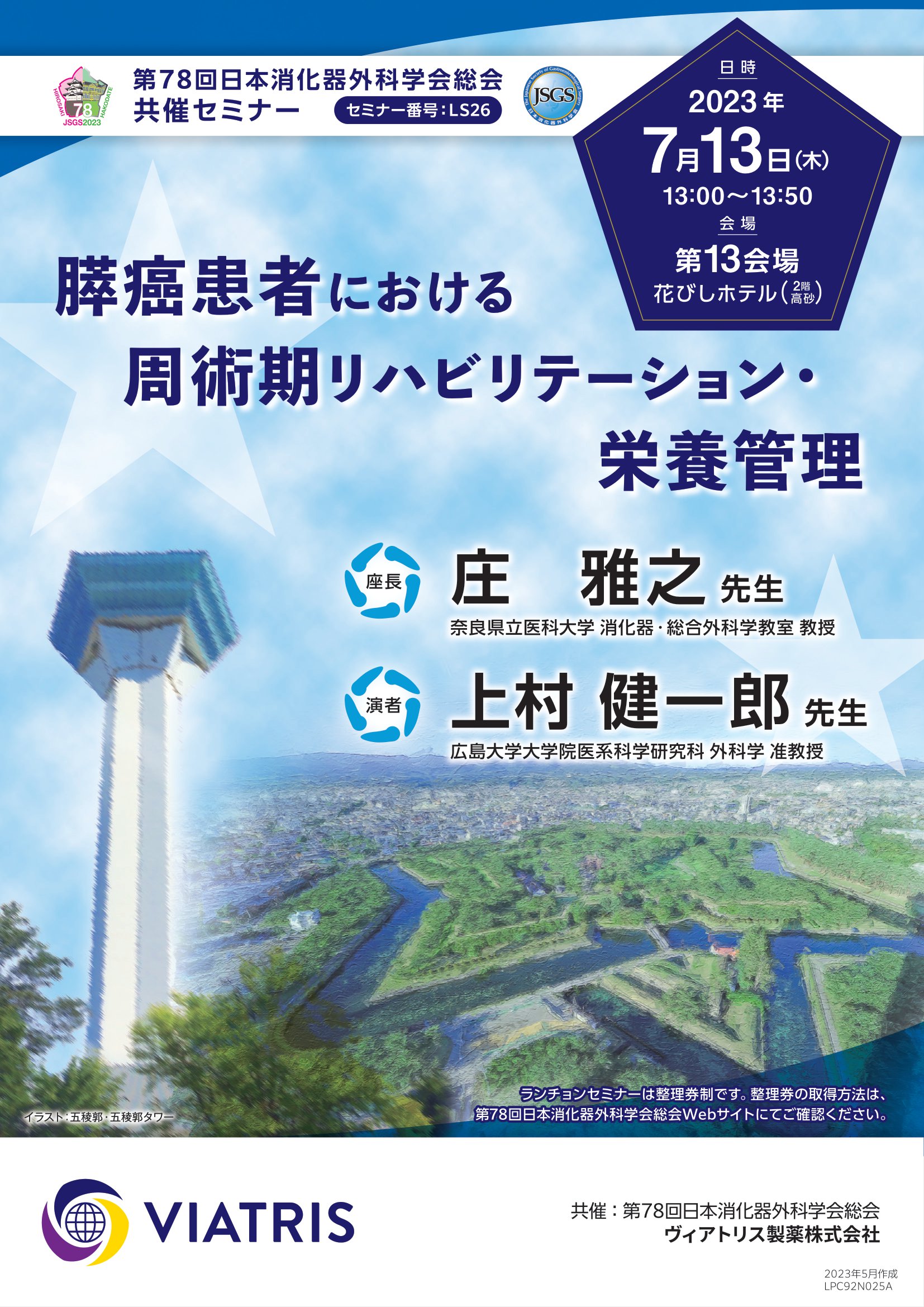 ランチョンセミナー26 膵癌患者における周術期リハビリテーション・栄養管理 2023年7月13日(木) 13:00 - 13:50 第13会場 | 花びしホテル 2階 高砂 共催:ヴィアトリス製薬株式会社 |