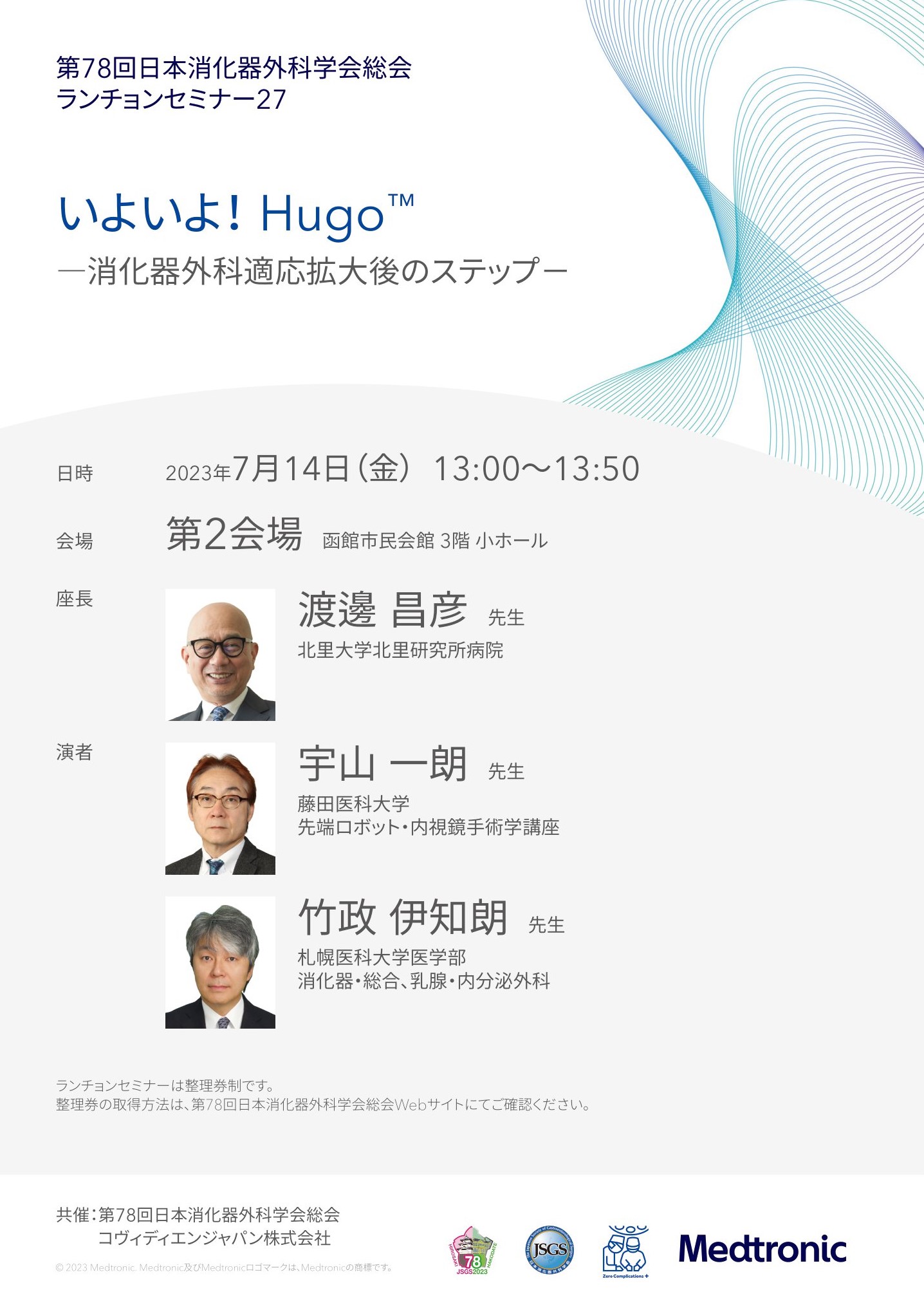 ランチョンセミナー27 いよいよ!Hugo™ ―消化器外科適応拡大後のステップ- 2023年7月14日(金) 13:00 - 13:50 第2会場 | 函館市民会館 3階 小ホール 共催:コヴィディエンジャパン株式会社 |