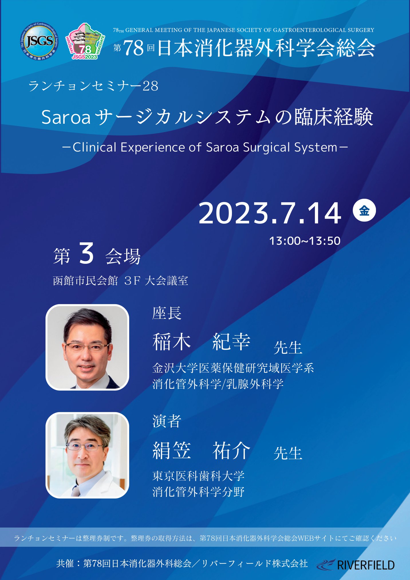 ランチョンセミナー28 Saroaサージカルシステムの臨床経験 ーClinical Experience of Saroa Surgical Systemー 2023年7月14日(金) 13:00 - 13:50 第3会場 | 函館市民会館 3階 大会議室 共催:リバーフィールド株式会社 |