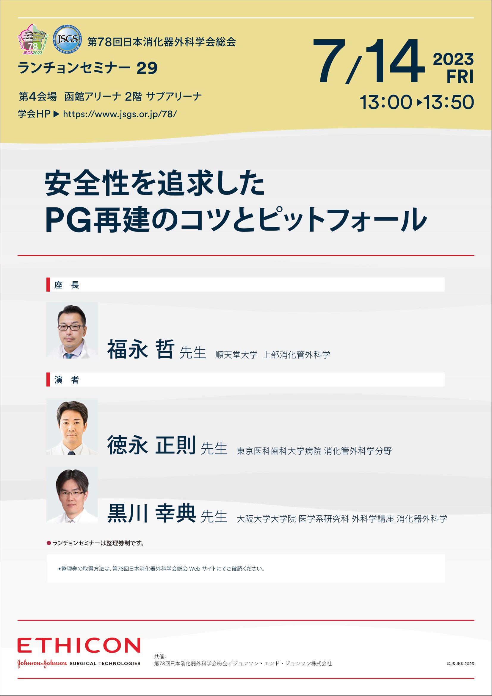 ランチョンセミナー29 安全性を追求したPG再建のコツとピットフォール 2023年7月14日(金) 13:00 - 13:50 第4会場 | 函館アリーナ 2階 サブアリーナ 共催:ジョンソン・エンド・ジョンソン株式会社 |