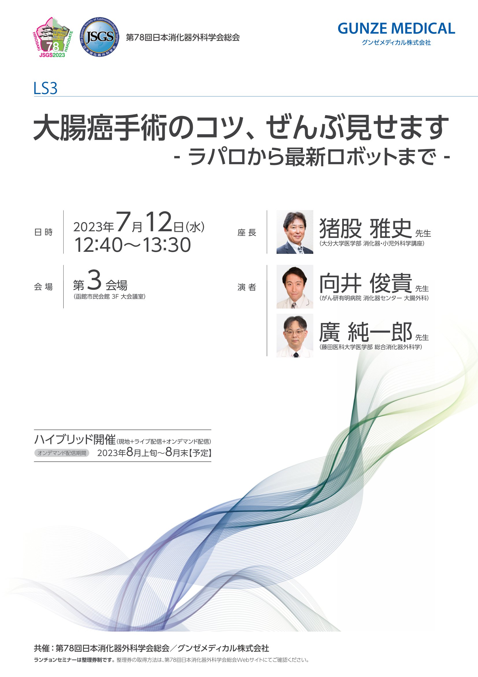 ランチョンセミナー3 大腸癌手術のコツ、ぜんぶ見せますーラパロから最新ロボットまで― 2023年7月12日(水) 12:40 - 13:30 第3会場 | 函館市民会館 3階 大会議室 共催:グンゼメディカル株式会社 |