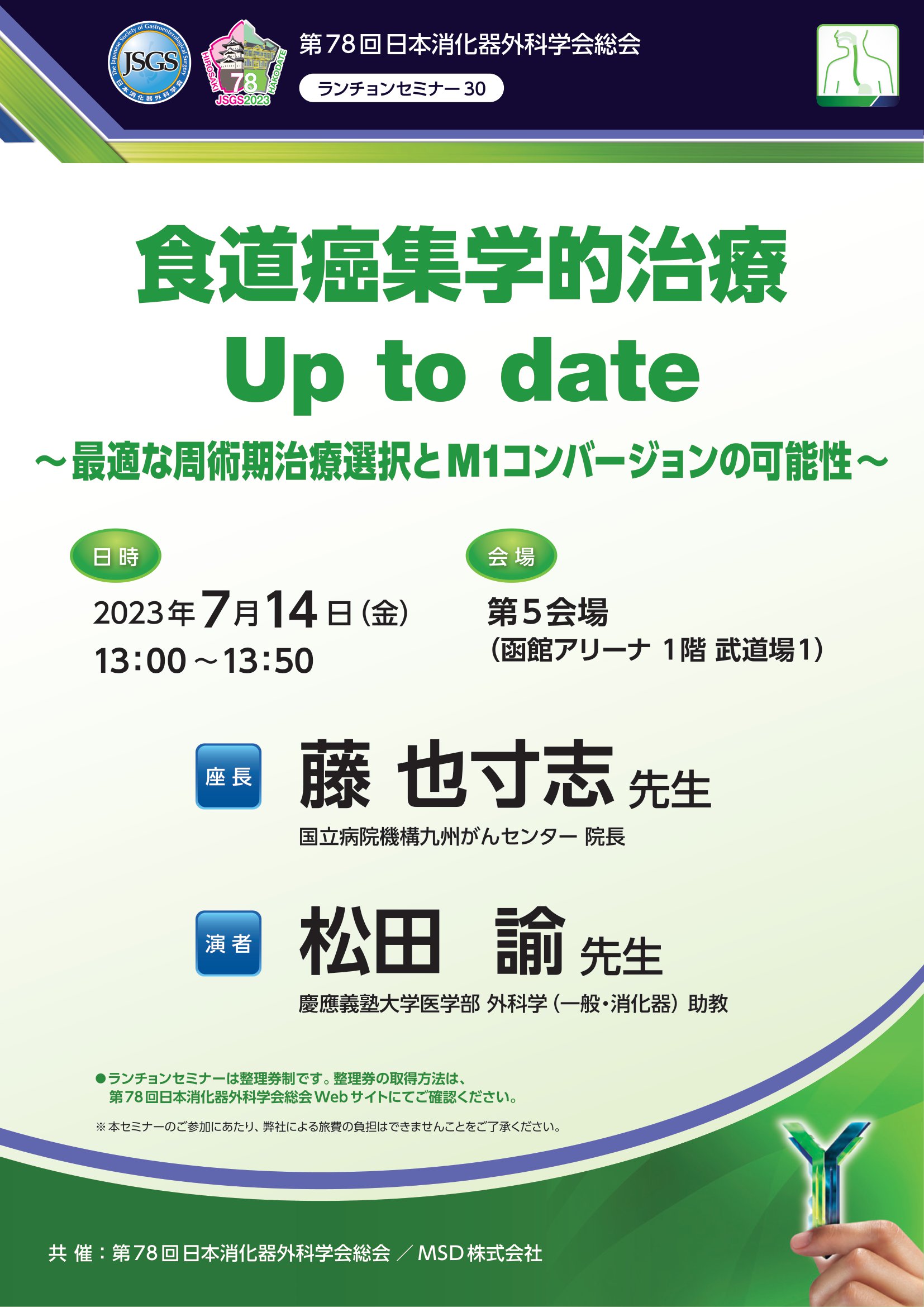 ランチョンセミナー30 食道癌集学的治療 Up to date ~最適な周術期治療選択とM1コンバージョンの可能性~ 2023年7月14日(金) 13:00 - 13:50 第5会場 | 函館アリーナ 1階 武道場1 共催:MSD株式会社 |