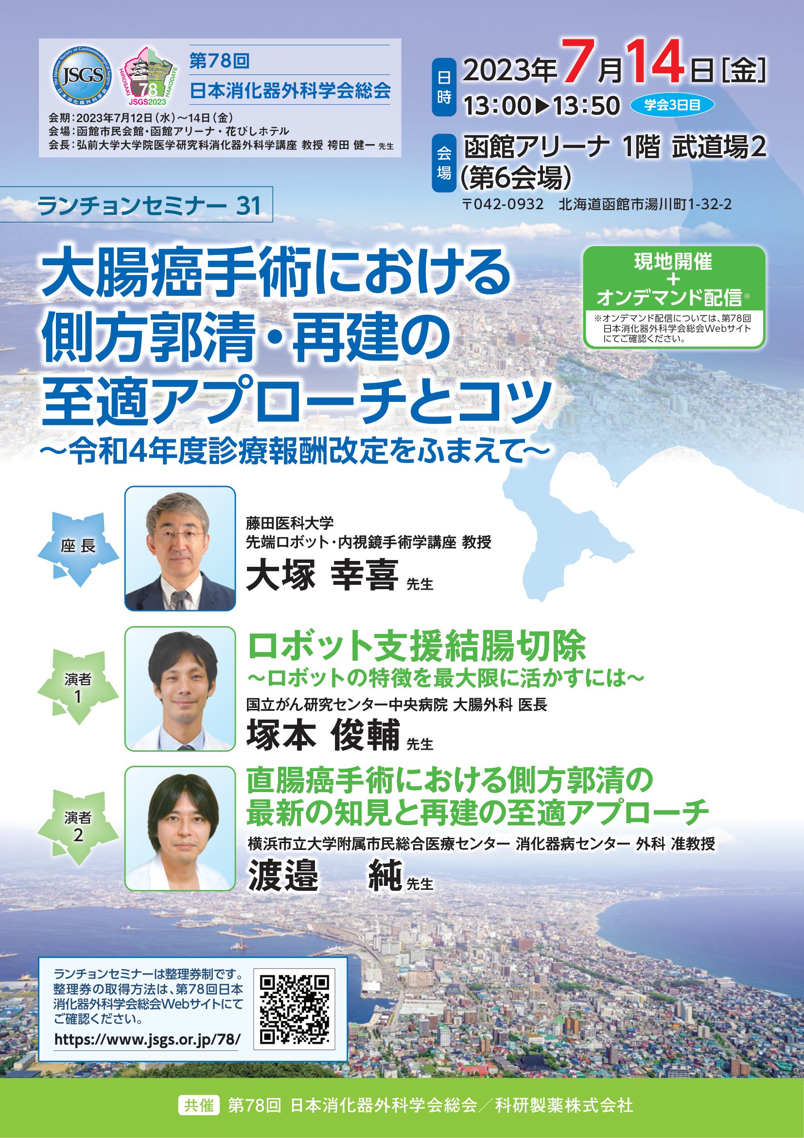 ランチョンセミナー31 大腸癌手術における側方郭清・再建の至適アプローチとコツ ~令和4年度診療報酬改定をふまえて~ 2023年7月14日(金) 13:00 - 13:50 第6会場 | 函館アリーナ 1階 武道場2 共催:科研製薬株式会社 |