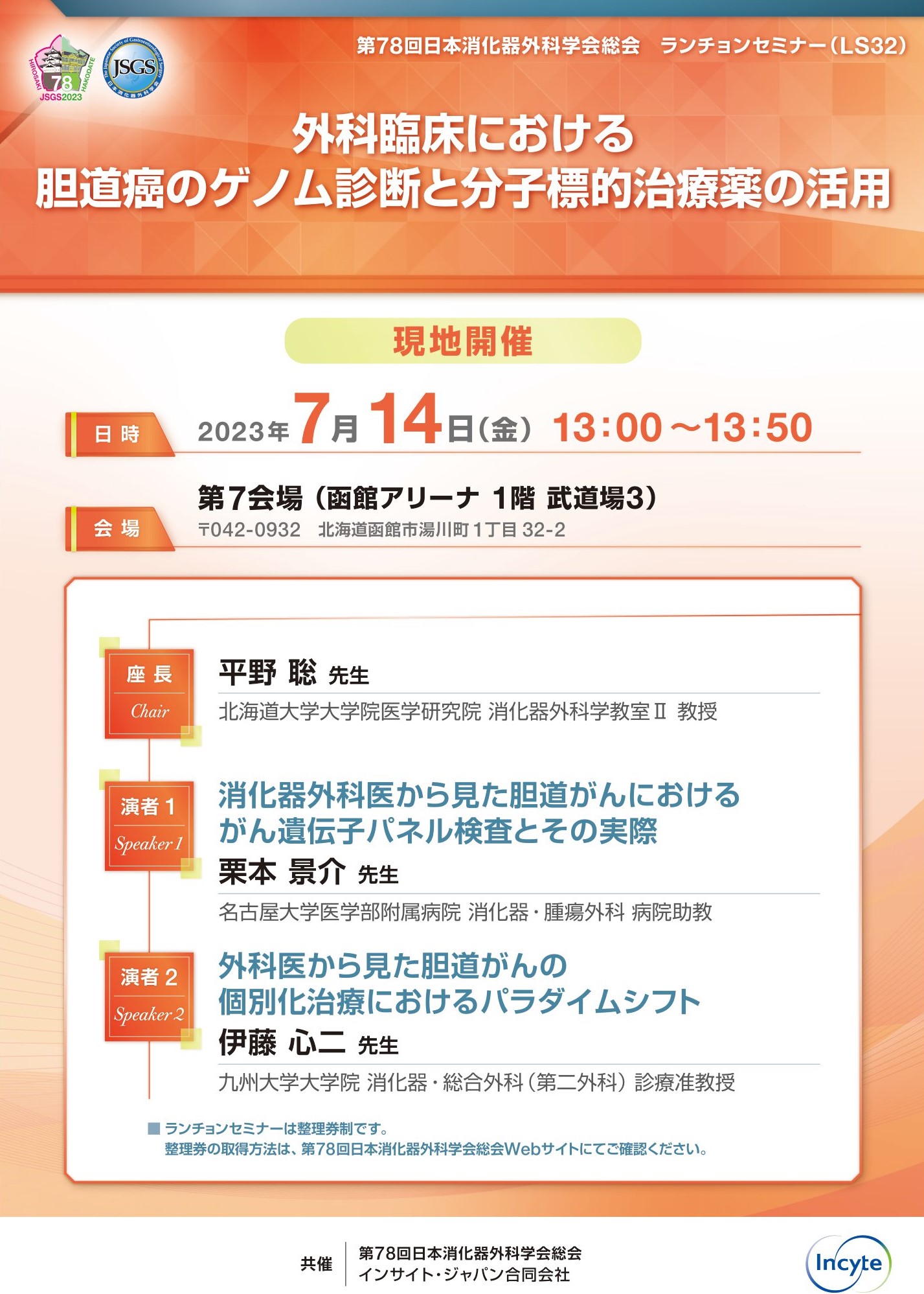 ランチョンセミナー32 外科臨床における胆道癌のゲノム診断と分子標的治療薬の活用 2023年7月14日(金) 13:00 - 13:50 第7会場 | 函館アリーナ 1階 武道場3 共催:インサイト・ジャパン合同会社 |
