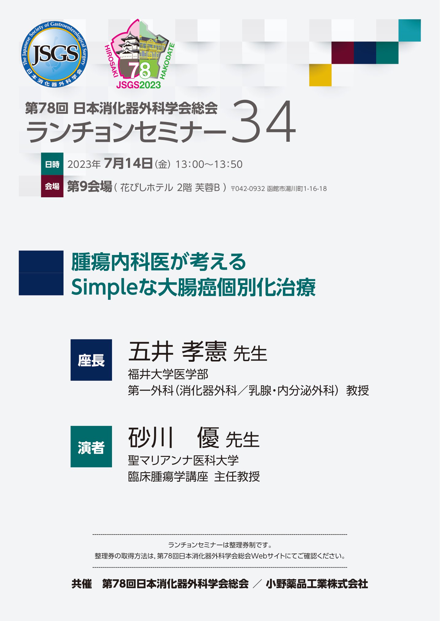 ランチョンセミナー34 腫瘍内科医が考えるSimpleな大腸癌個別化治療 2023年7月14日(金) 13:00 - 13:50 第9会場 | 花びしホテル 2階 芙蓉B 共催:小野薬品工業株式会社 |