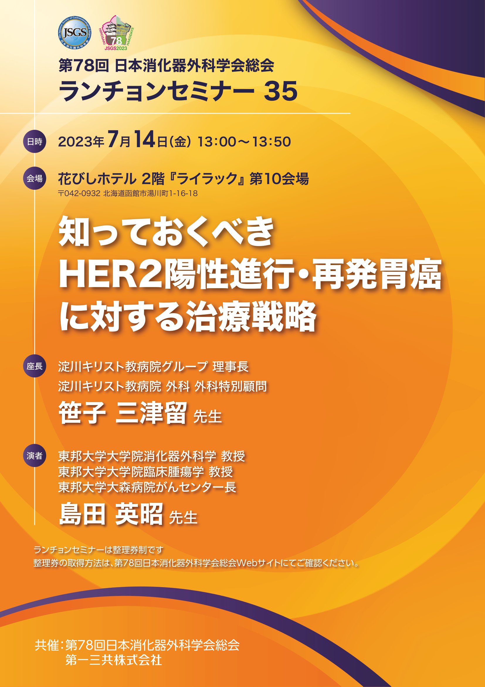 ランチョンセミナー35 知っておくべきHER2陽性進行・再発胃癌に対する治療戦略 2023年7月14日(金) 13:00 - 13:50 第10会場 | 花びしホテル 2階 ライラック 共催:第一三共株式会社 |