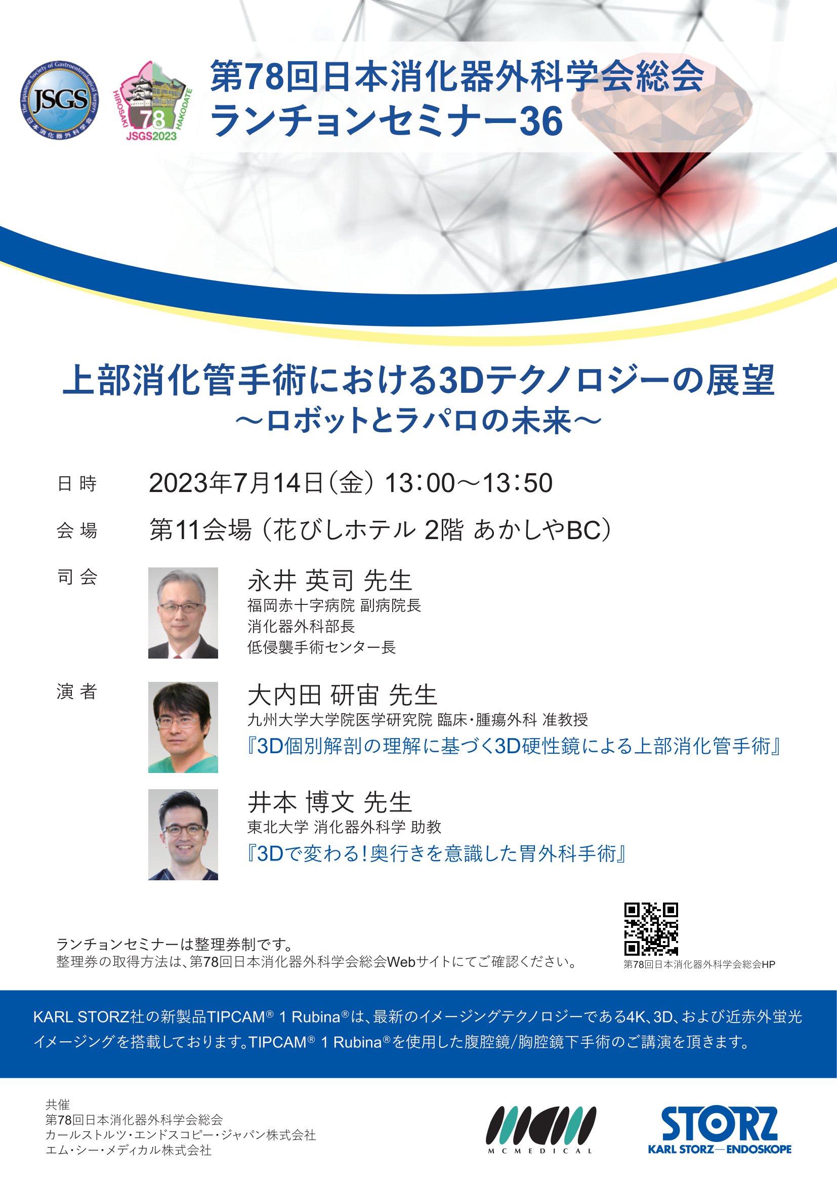 ランチョンセミナー36 上部消化管手術における3Dテクノロジーの展望 ~ロボットとラパロの未来~ 2023年7月14日(金) 13:00 - 13:50 第11会場 | 花びしホテル 2階 あかしやBC 共催:カールストルツ・エンドスコピー・ジャパン株式会社/エム・シー・メディカル株式会社 |