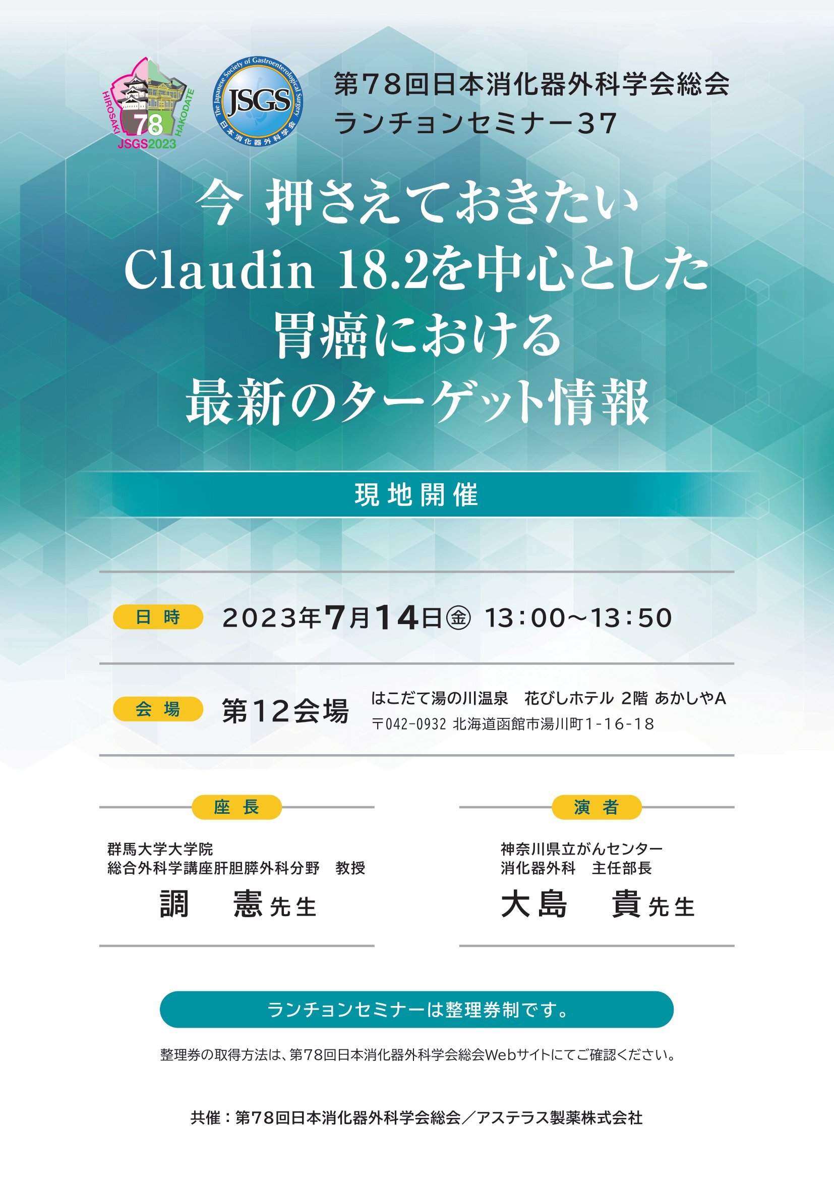 ランチョンセミナー37 今 押さえておきたい Claudin 18.2を中心とした胃癌における最新のターゲット情報 2023年7月14日(金) 13:00 - 13:50 第12会場 | 花びしホテル 2階 あかしやA 共催:アステラス製薬株式会社 |